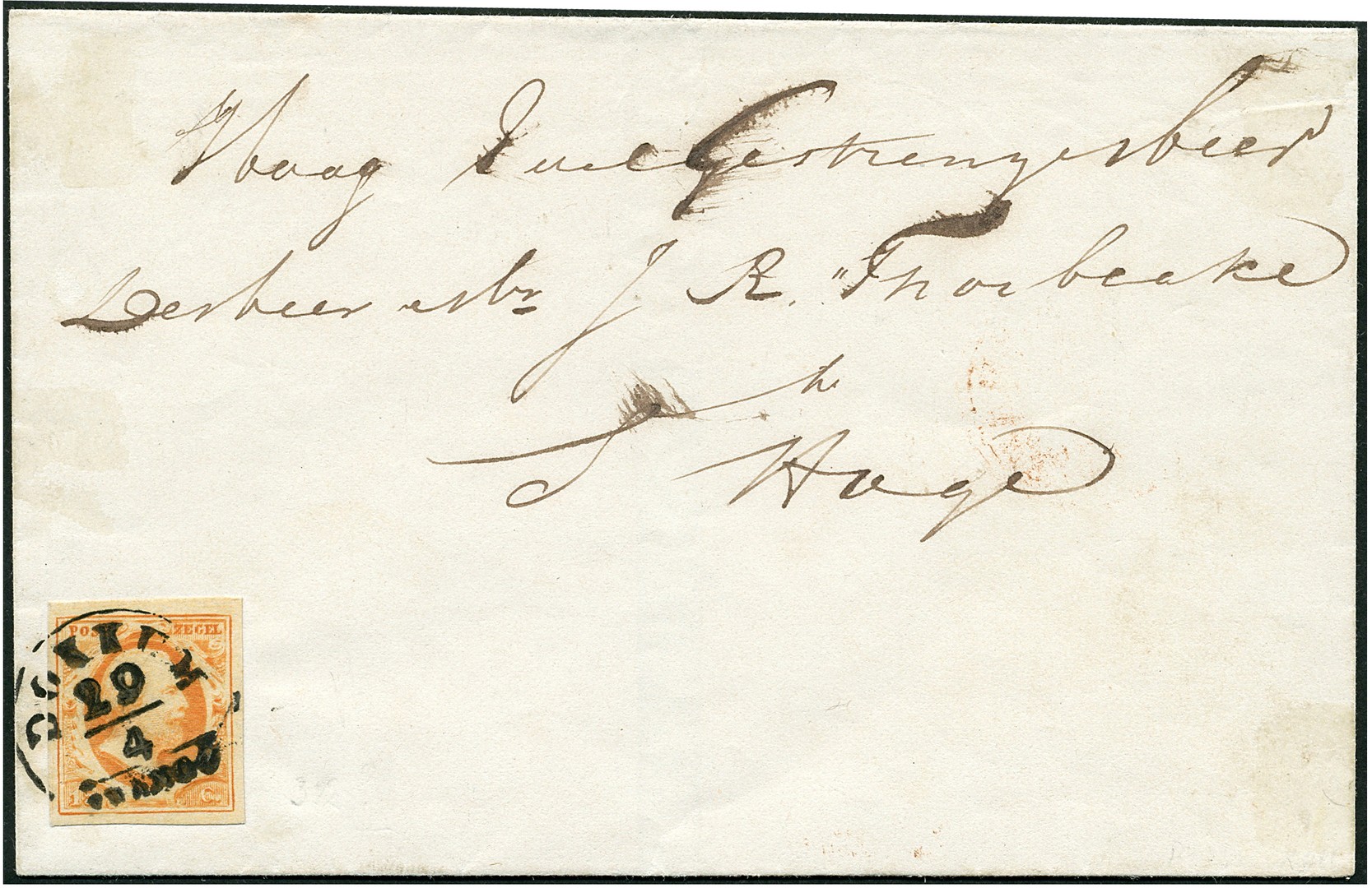 DOKKUM A (EY.700) op 15 cent donkeroranje. Prachtex. met voor dit stempel bijzonder mooie afdruk op frisse briefomslag van 29-4(-1853) naar de staatsman Thorbecke te 'sGravenhage 1-5. Zeldzaam in deze kwaliteit. Ex Van Hussen