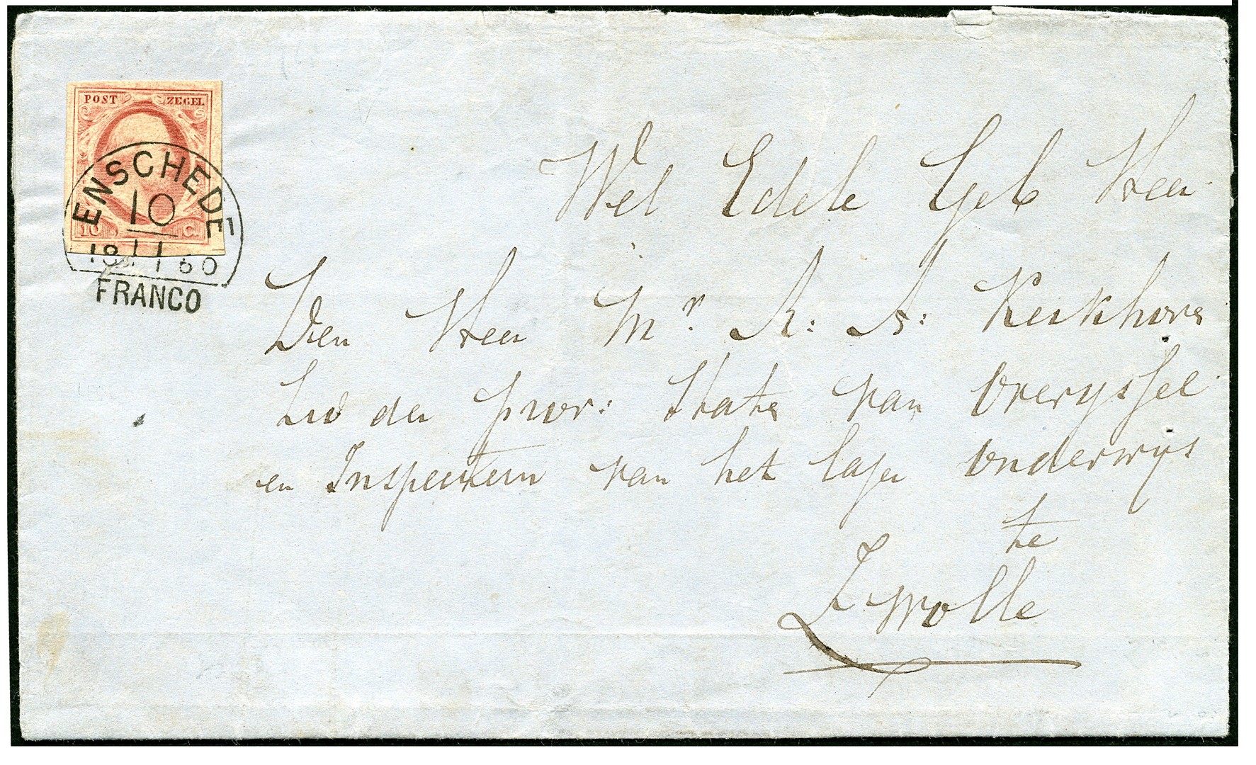 ENSCHEDE C (EY.125) op 10 cent dofrood nr. 2j-Pl.V-46. Breed gerand prachtex. met bijzonder mooie afst. op frisse, complete vouwbrief van het hulppostkantoor Haaksbergen (az. naamstempel in zwart) via Enschede 10-11-1860 naar Zwolle 1011. Ex Van Hussen en De Jong