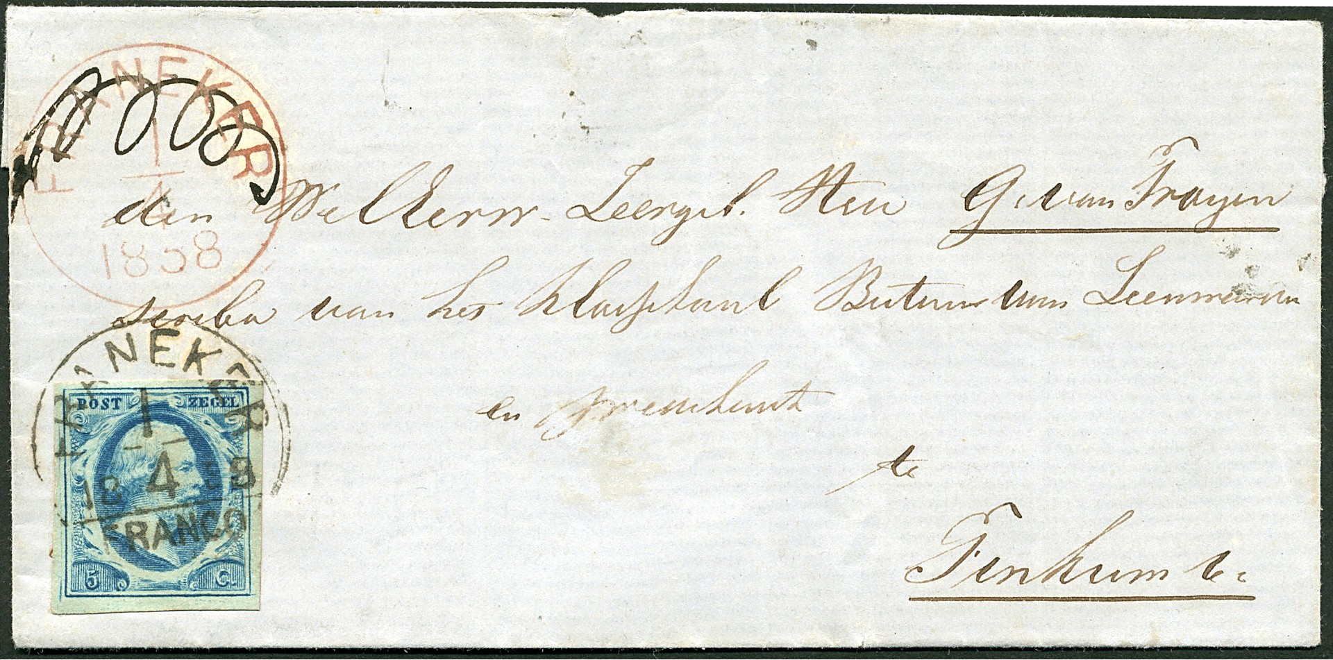 FRANEKER C (EY.400) op 5 cent blauw nr. 1j-Pl.III-86. Prachtex. met mooie afst. op frisse vouwbrief van hulppostkantoor Stiens (az. naamstempel in zwart) over Franeker, dat per abuis eerst boven de zegel stempelde met het rondstempel, daarna de kantoornaam doorhaalde, op 1-4-1858 naar een eerwaarde zeergeleerde heer te Finkum (ca. 2 km ten noorden van Stiens). Zeldzame brief!