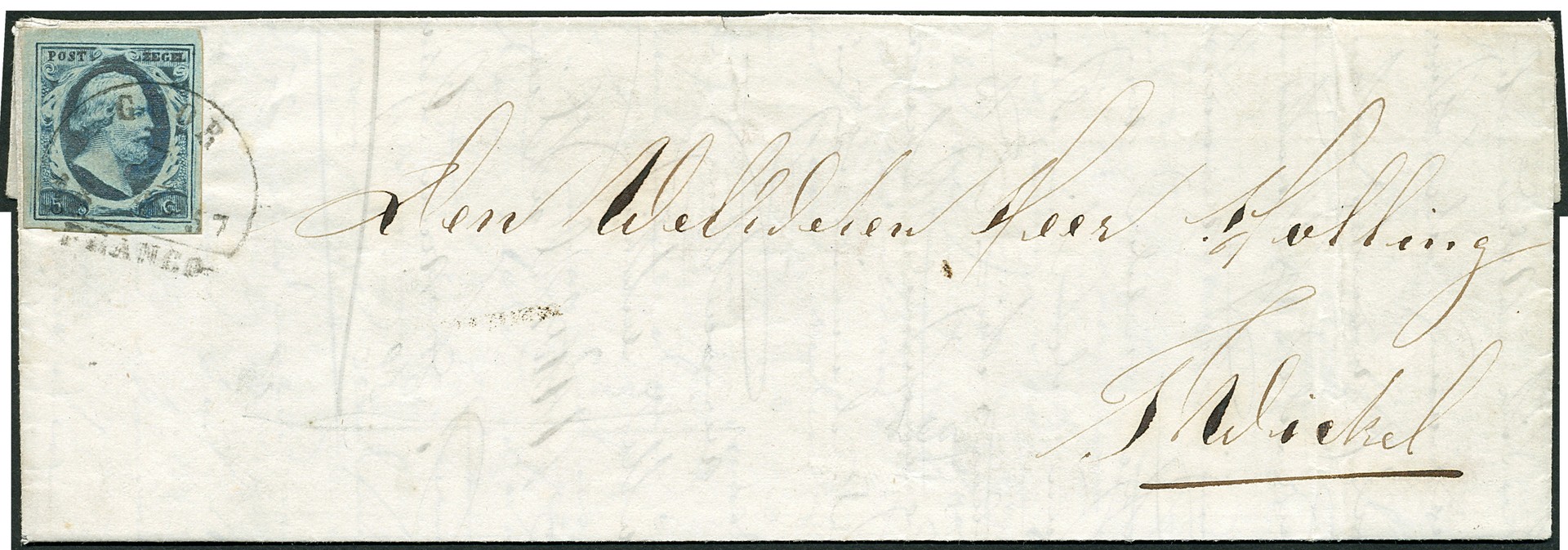 GOOR B (EY.100) op 5 cent in zwartblauwe nuance nr. 1h-Pl.III-8. Breed gerande prachtzegel op frisse vouwbrief van 7-4-1857 naar het nabijgelegen Twickel met het prachtige kasteel