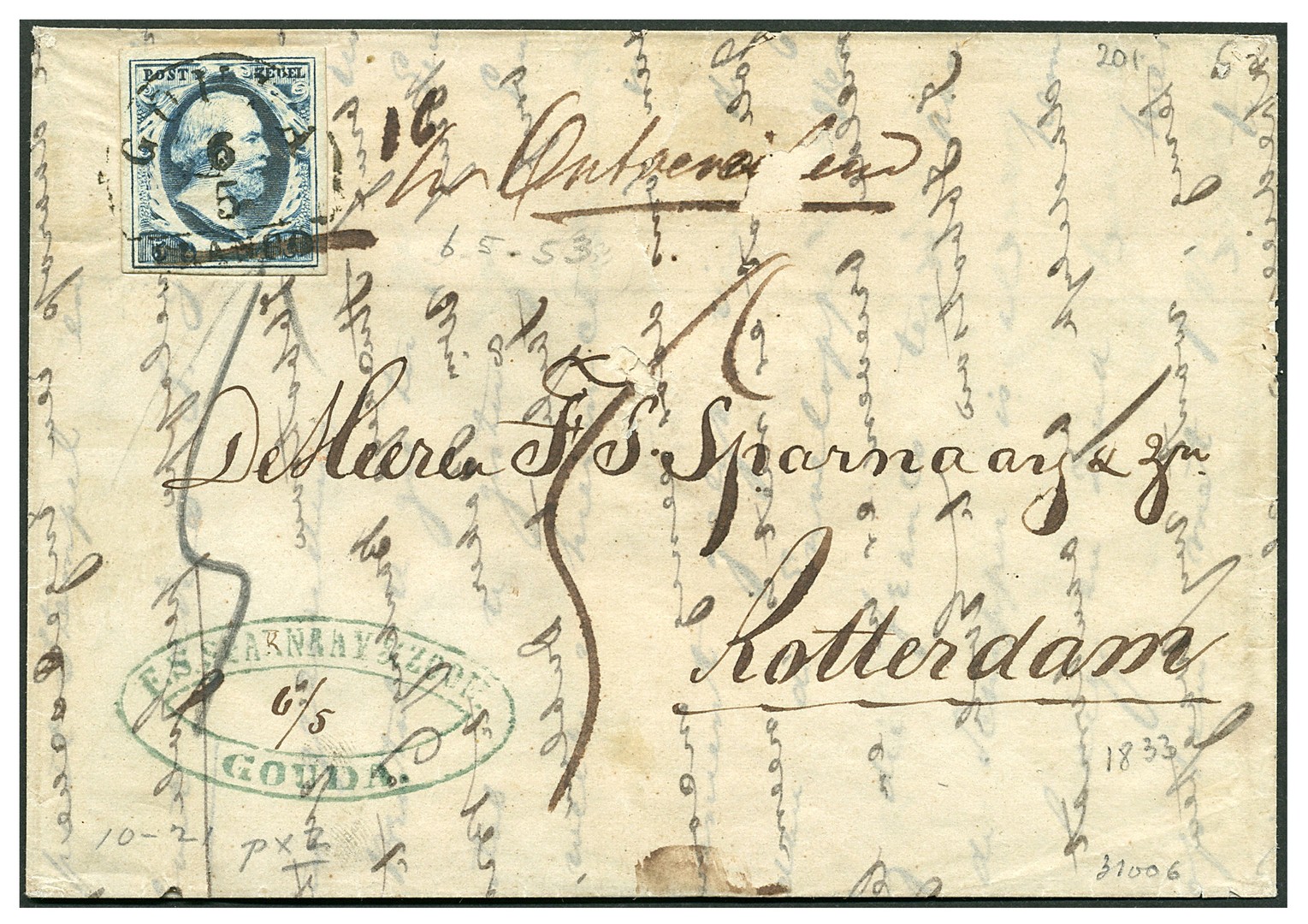 GOUDA A (EY.50) op 5 cent blauw nr. 1b-Pl.I. Prachtex. met volledige afst. waarvan ´Franco´ met de pen is doorgehaald op ´Ontoereikend´ gefr. vouwbrief, omdat de brief 16 gram woog (2e gew. klasse, port 10 cent), op 6-5(-1853) naar de rederij Sparnaay te Rotterdam, die voor de ontvangst op 6-5 nog 5 cent moest betalen