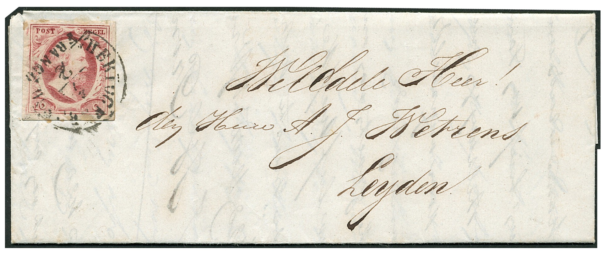 'sHERTOGENBOSCH A (EY.50) op 10 cent karmijn nr. 2d-Pl.II-40. Prachtex. met volledige, wat gevlekte afst. op complete vouwbrief van 7-2(-1855) naar Leiden 8-2-1855