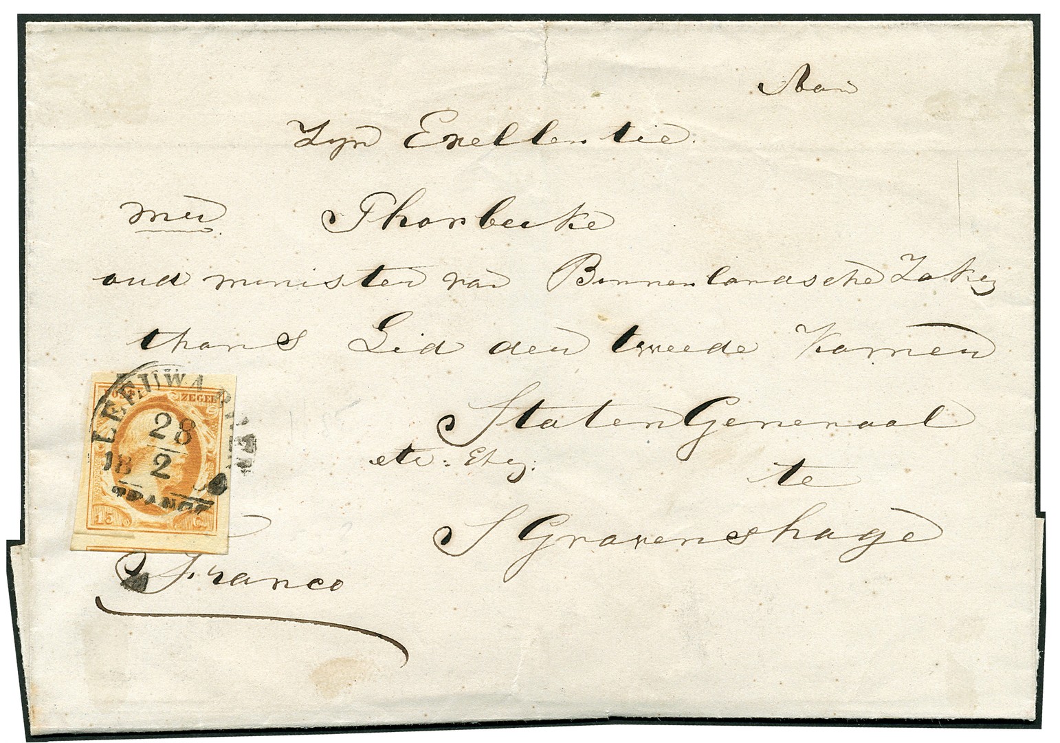 LEEUWARDEN B klein (EY.175) op 15 cent donkeroranje. Zeer breed gerand prachtex. met als gebruikelijk iets licht gevlekte afst. op mooie briefomslag op 28-2-1854 naar de staatsman Thorbecke in 'sGravenhage 1-3