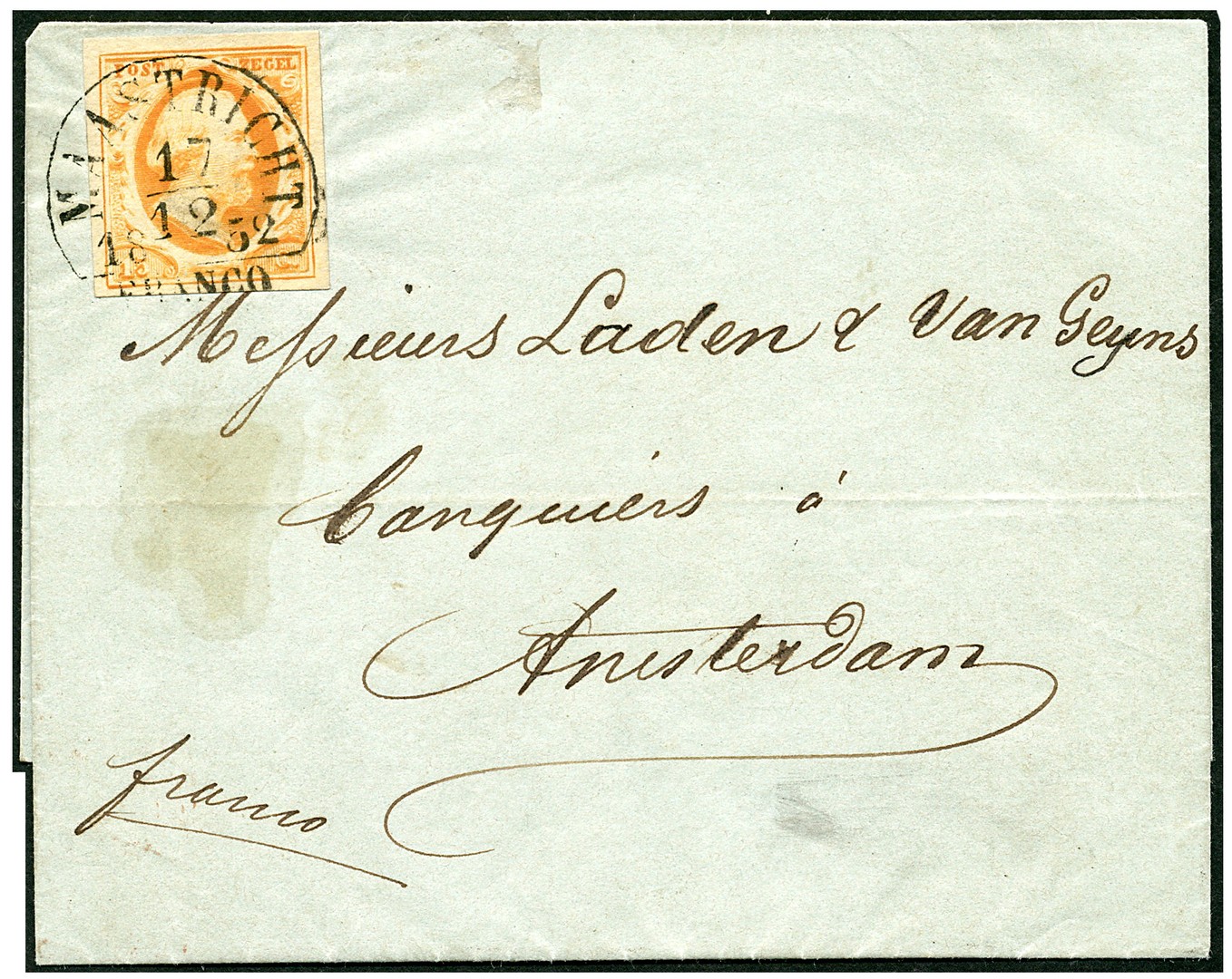 MAASTRICHT B (type 2 EY.125) op 15 cent nr. 3b. Mooi gerande prachtzegel op briefomslag van 17-12-1852 naar bankiers in Amsterdam 18-12. Attest ´R. Bouscher 2012´