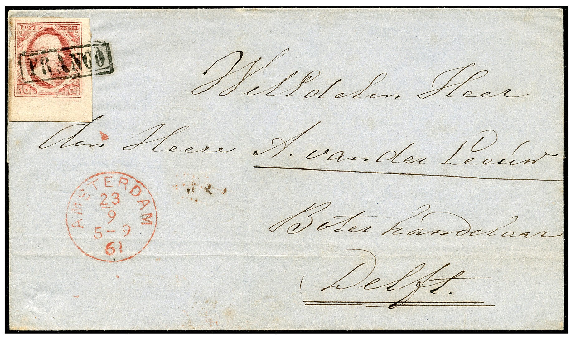 10 Cent nr. 2m-Pl.VII-50 als zeer breed gerand pracht hoekstuk op briefomslag van Amsterdam 23-9-1861 naar een boterhandelaar te Delft 24-9