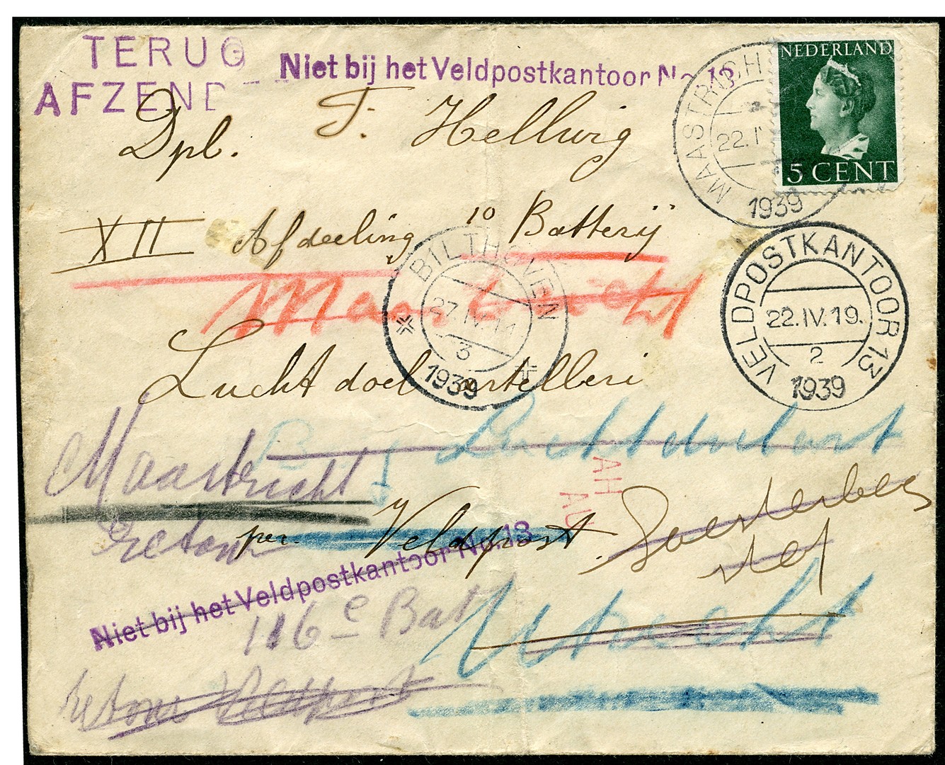 Env. waarop 5c (naar ons idee later opgeplakt) van Maastricht 22-4-1939 langs allerlei veldpostkantoren op zoek naar een dienstplichtige. Voor uw veldpostcollectie!