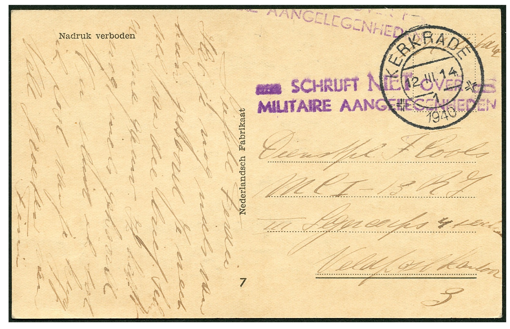 Prentbk. waarop verwachtingsvol kijkende schoonheid van Kerkrade 12-3-1940 naar een veldpostadres met in violet 'Schrijft NIET over / Militaire Aangelegenheden'