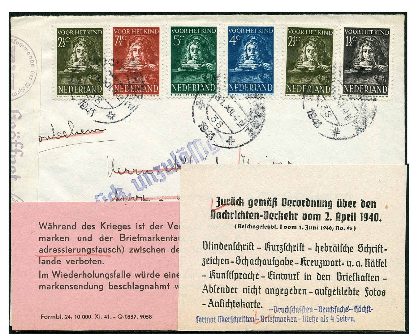 Kind 1941 op twee env. met inhoud (verzoek om toezending nieuwe zegels) beide aangetekend verz. van 'sGravenhage Oudjaar 1941 naar Hongarije resp. Roemenië, en beide onderschept door de Duitse censuurdienst: verzenden en ruilen van postzegels is niet toegestaan. In env. naar Hongarije zit bijgevoegd een roze strookje 'Während des Krieges...', in die naar Roemenië een wit strookje in met algemene tekst in Gotisch schrift 'Zurück gemäß Verordnung...'