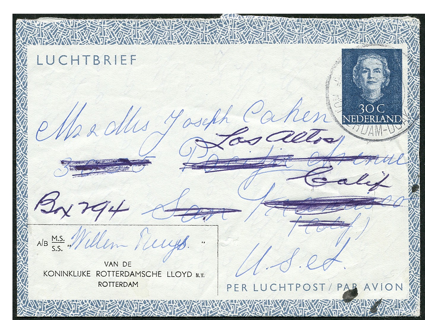 Particulier bedrukt luchtpostblad van de Rott. Lloyd, RL1, afgest. Postagent / Rotterdam-Djakarta 8-8-1951 naar San Francisco 18-8