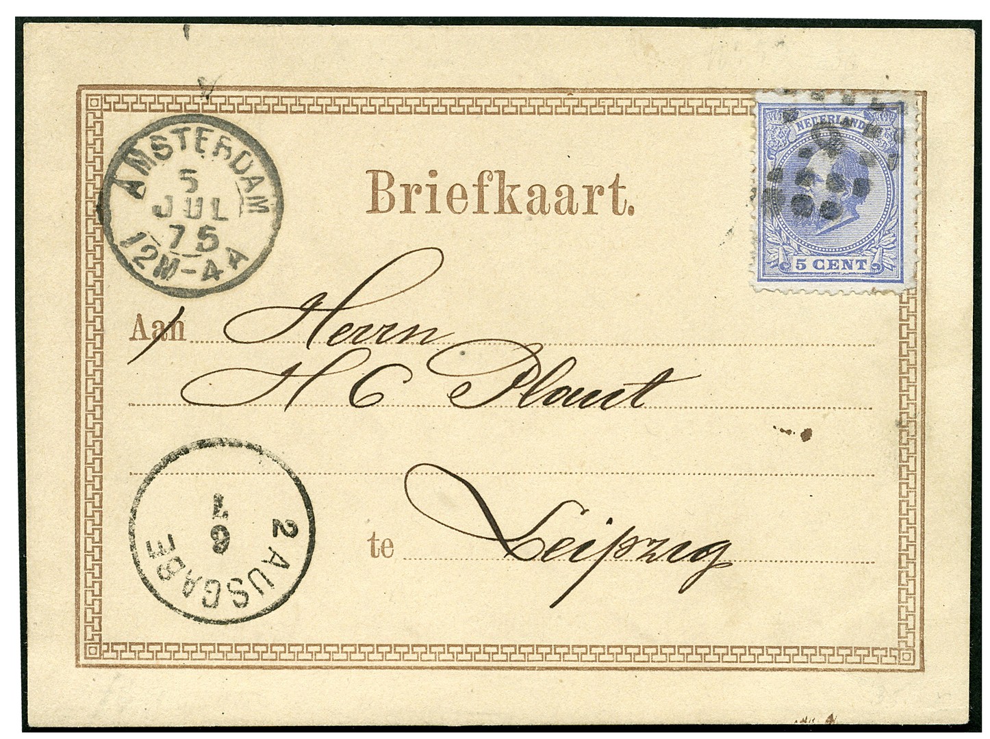 Briefkaartformulier II gefr. met 5c van Amsterdam 5-7-1875 naar Leipzig 6-7 (razendsnelle verzending). € 250