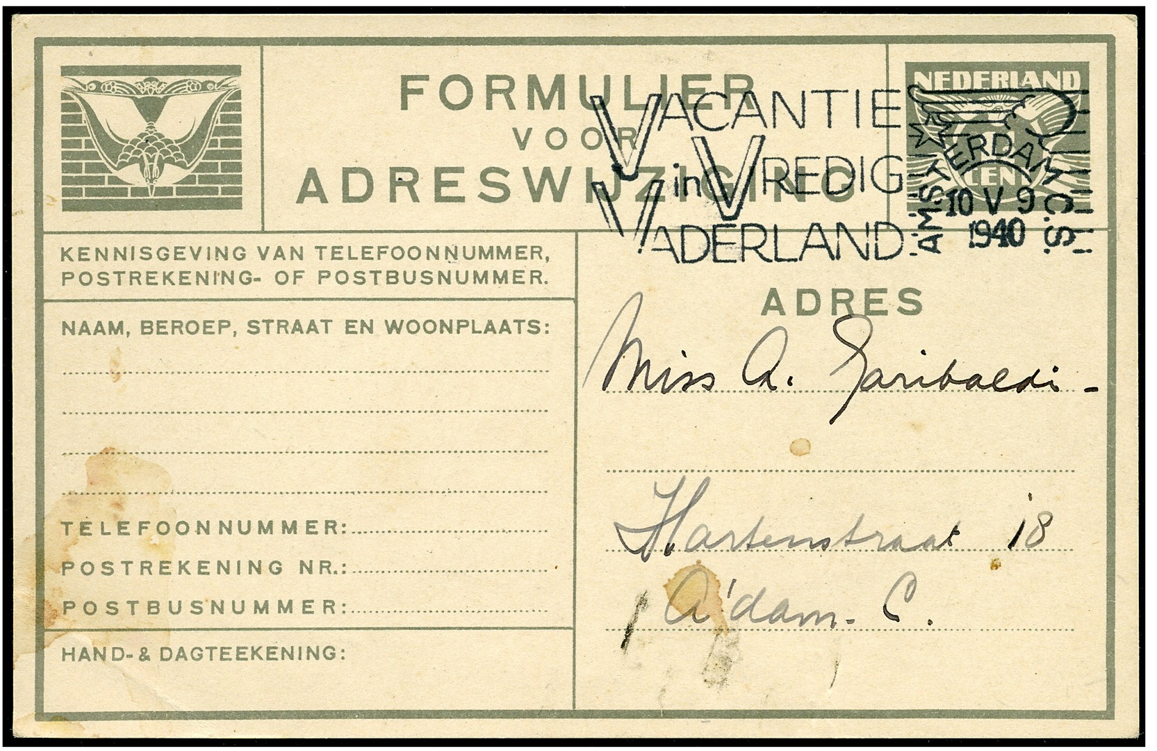 Vhk. G13 (vlekjes) afgest. te Amsterdam C.S. met vlag 'Vacantie / in Vredig / Vaderland' op 10 mei 1940