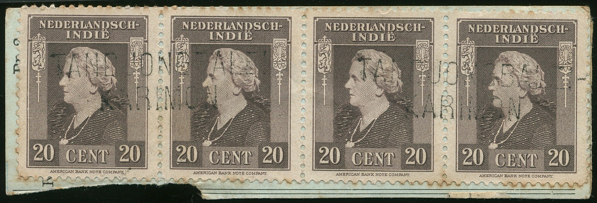 Naamstempel TANDJONGBALEI- / KARIMON 2x op 20c type ABC in zeer fraaie strip van vier op knipsel. Zeldzaam!