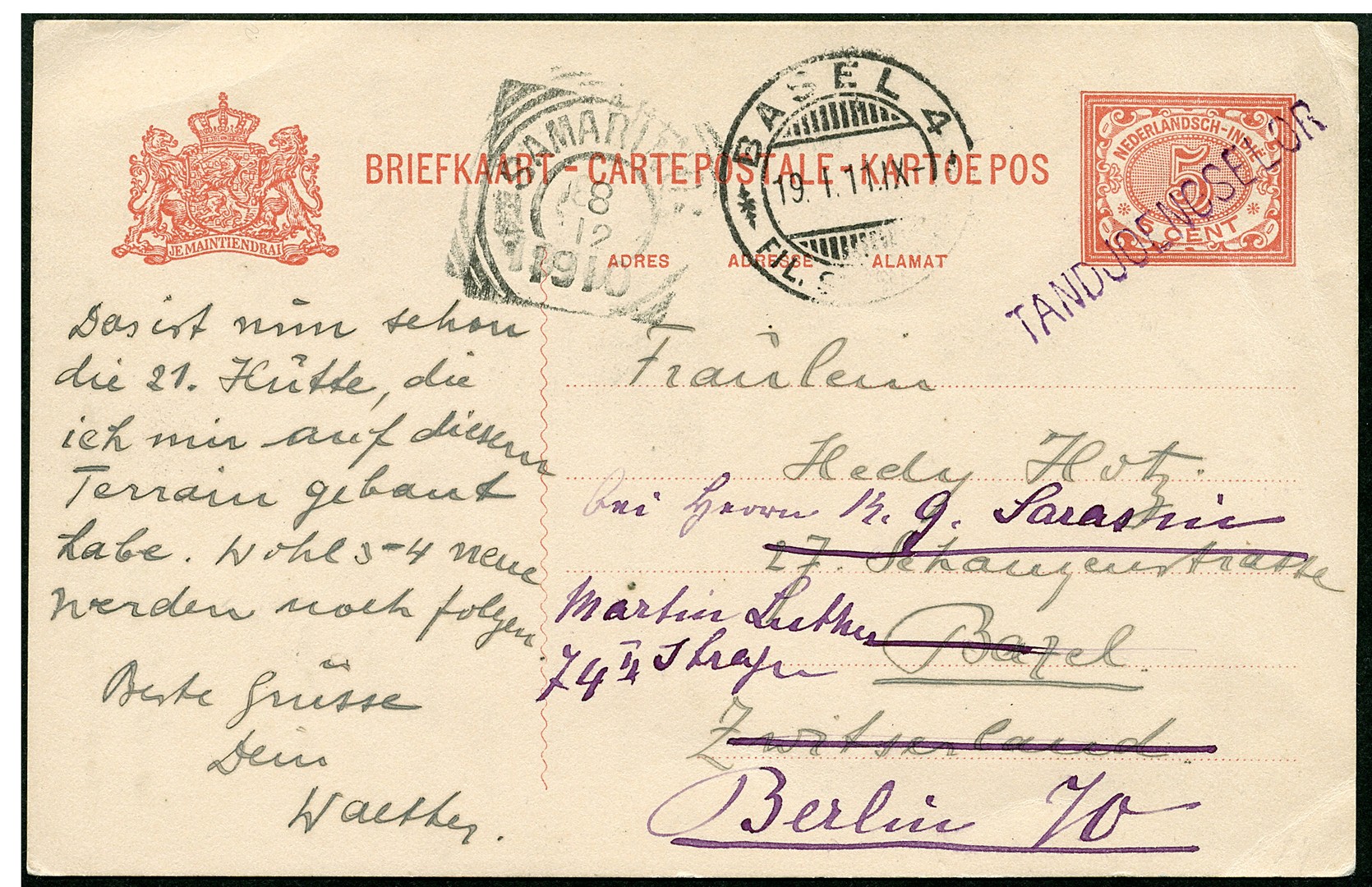 DUITSLAND. Bk. G21 geschreven te Soengei Bingor-Boelongan 23-11-1910, diep in de binnenlanden van Oost-Borneo, prachtig afgest. met naamstempel TANDJOENGSELOR in violet (SvL 400) via Samarinda 8-12 naar Basel 19-1-1911, kosteloos doorgez. naar Berlijn. Zeldzaam naamstempel in luxe kwaliteit!
