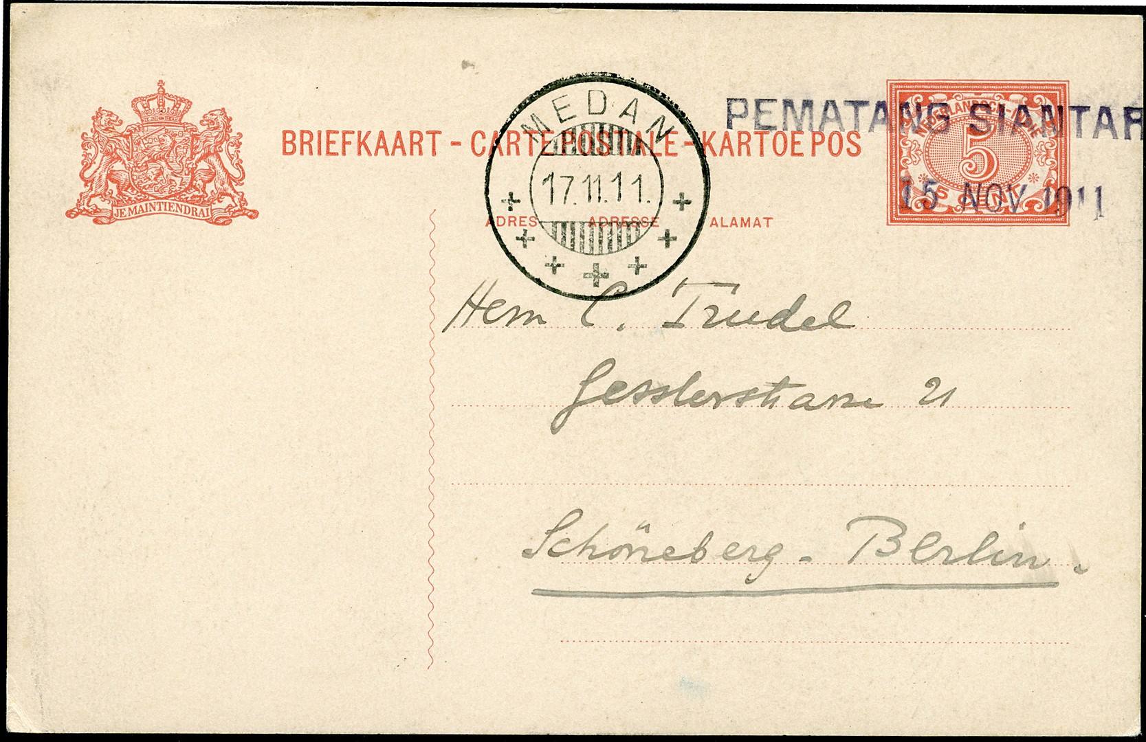 DUITSLAND. Bk. G21 superbe afgest. in blauw met naamstempel PEMATANG SIANTAR waaronder 15 NOV 1911 via Medan 17-11-1911 naar Berlijn-Schöneberg. Mooier kan niet!