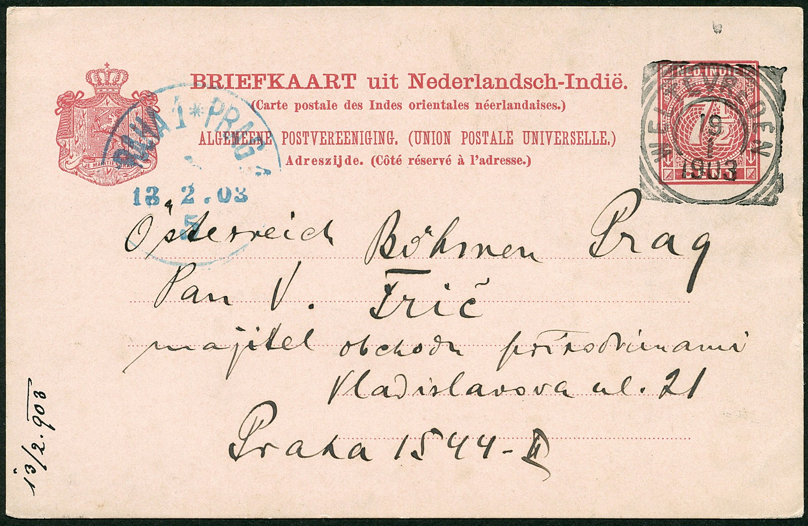OOSTENRIJK-HONGARIJE. Drie briefkaarten naar Praag. G12 uit Weltevreden 19-1-1903, prentbk. uit Soerabaja 7-6-1902 en in Smichov beport (portzegel fraai), alsmede prentbk. uit Salatiga 8-12-1903