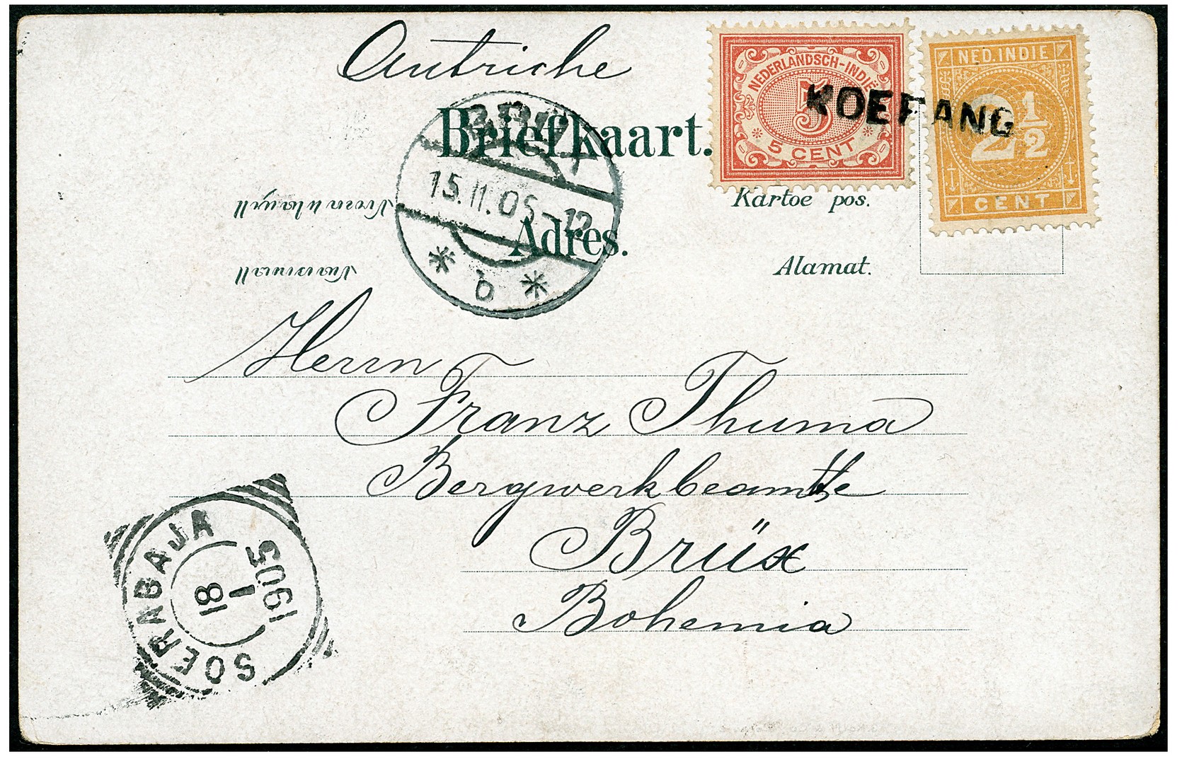 OOSTENRIJK-HONGARIJE. Prentbk. met mengfrankering 2½c nr. 19 en 5c nr. 46 waarop naamstempel KOEPANG via Soerabaja 18-1-1905 naar Brüx 15-2, alsmede bk. G21 geschreven op 2-11-1909 met naamstempel BANDJAR naar Brünn (SvL 150)