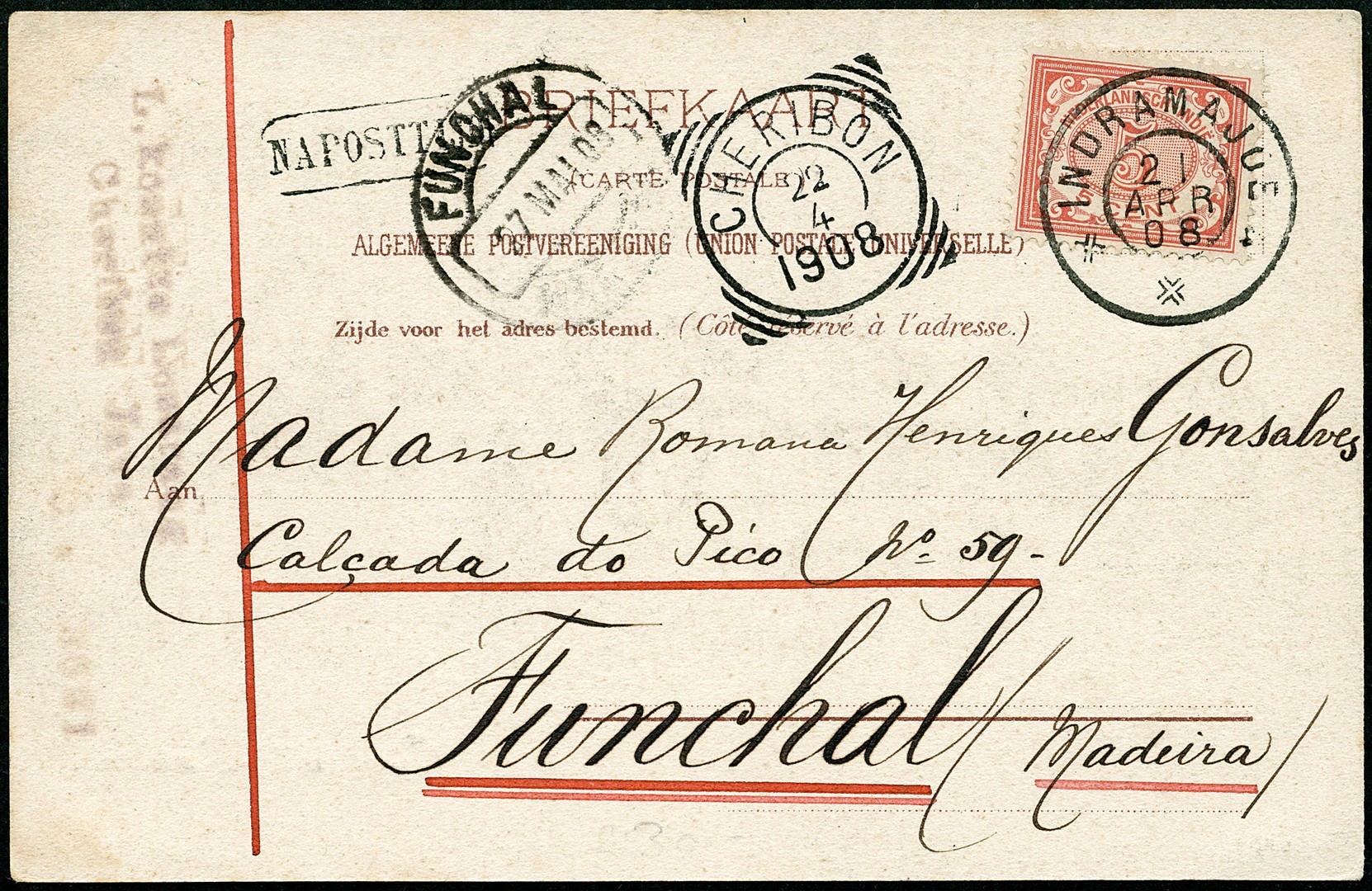 PORTUGAL. Twee prentbk. uit Indramajoe 21-4-1908 resp. Sabang 14-1-1909, beide naar Funchal op Madeira met aankomst 27-5 resp. 17-2