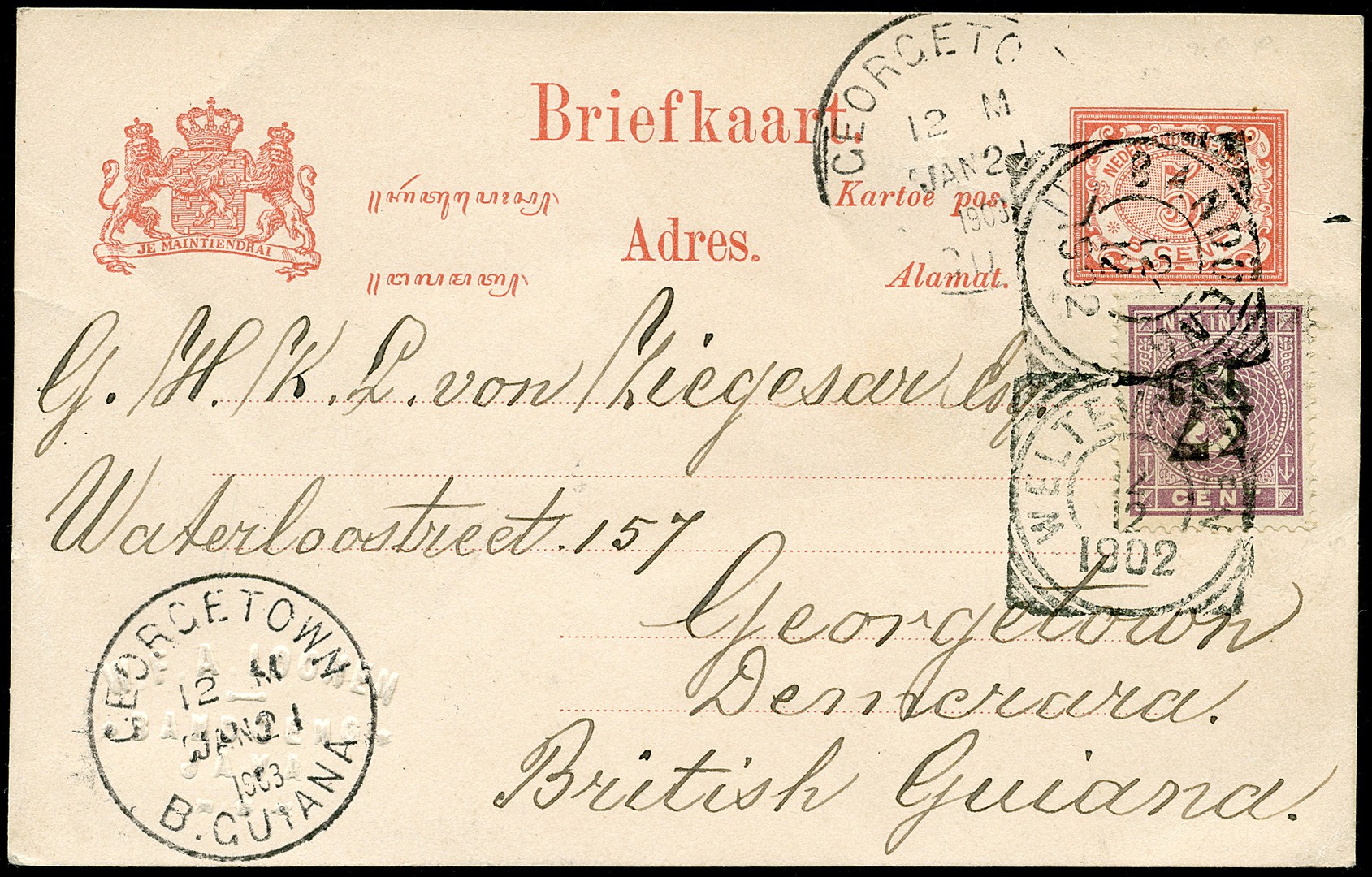 AMERIKA. BRITS-GUIANA. Bk. G14 (az. dunne plek, afzender in preegdruk) bijgefr. met 2½c van Bandoeng 12-12-1902 over Weltevreden 12-12 naar Georgetown 21-1-1903