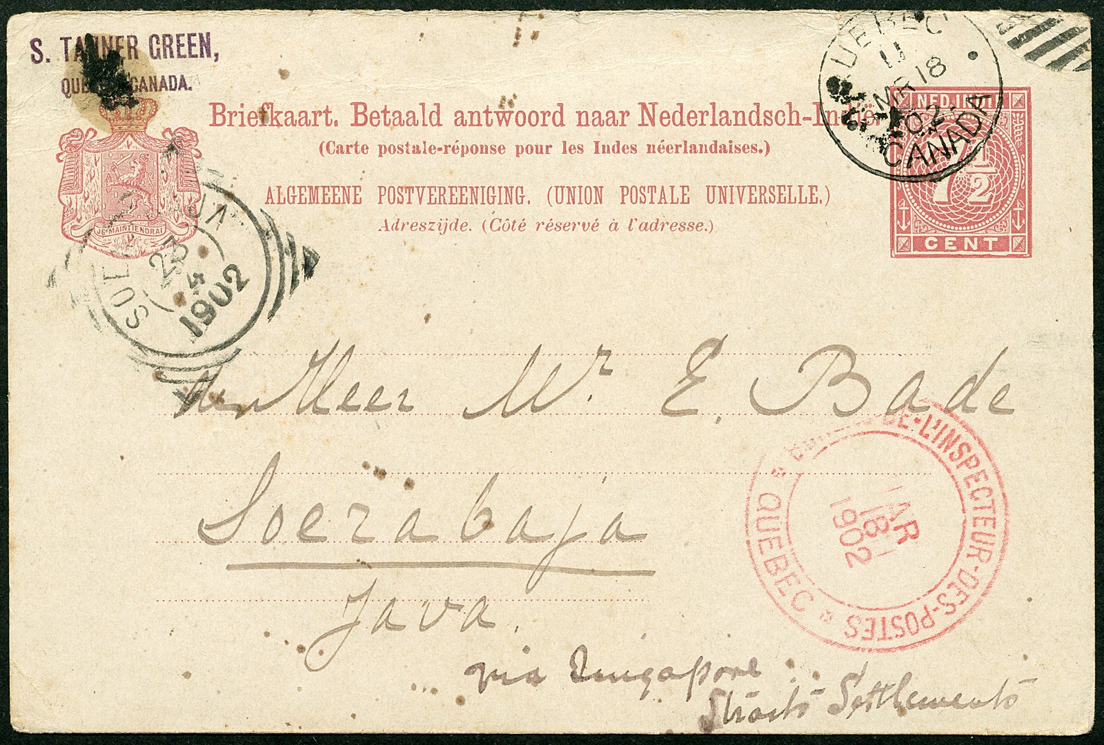 AMERIKA. CANADA. Bk. G13 (A-kaart, vlekje) van Quebec 18-3-1902 naar Soerabaja 23-4