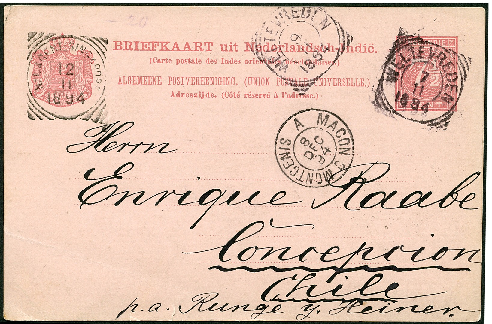 AMERIKA. CHILI. Bk. G12 van Weltevreden 7-11-1894 via de N.I.Agent Singapore 12-11 en het Franse traject Montcenis à Macon 8-12 naar Concepción 7-1-1895. Opmerkelijke route (French Connection?)