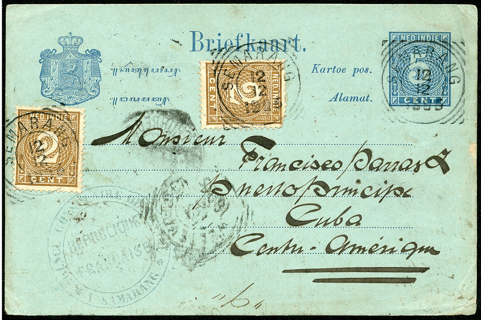 AMERIKA. CUBA. Bk. G10 bijgefr. met 2c (2x, 1 ex. fraai) van Semarang 12-12-1896 via Weltevreden naar Havana 30-1-1897 (az.). Tevens bk. G21 van Indramajoe 18-10-1911 ‘Na Posttijd’ naar Havana (datumstempeltje in blauw van 27-11-1911). Schaarse bestemming!