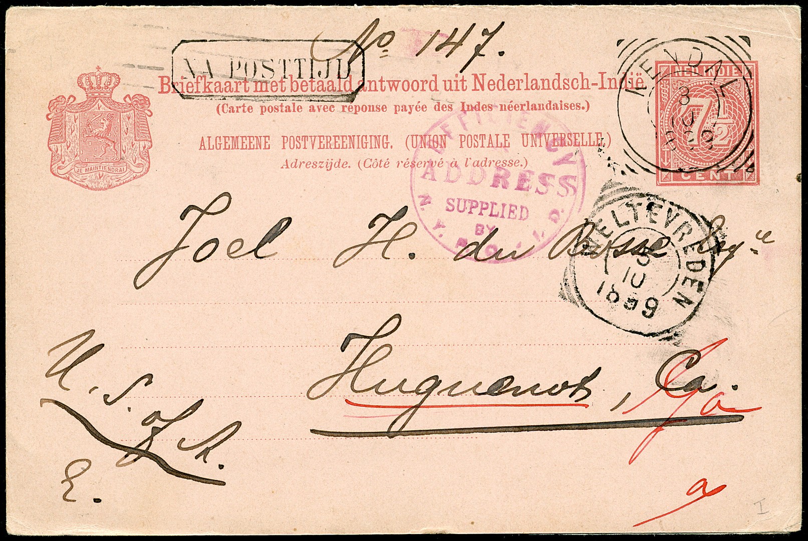 AMERIKA. USA. Dubbele bk. G13 ‘Na Posttijd’ van Kendal 3-10-1899 over Weltevreden via New York 16-11 naar Huguenot, per abuis ‘Ca’ doch moet niet gevonden worden in California maar in ‘Ga’ oftewel Georgia. Roodviolet stempel ‘Deficiency / Address / Supplied / by / N.Y.P.O.-I.D.’. De aanhangende A-kaart is niet afgestempeld. Curieuze adressering, vooral interessant voor de USA-verzamelaar van posthistorie!