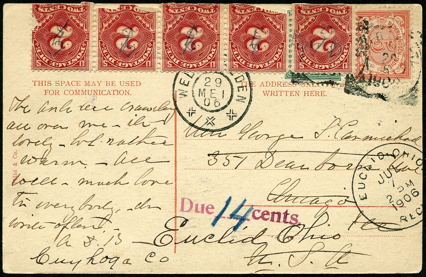 AMERIKA. USA. Prentbk. gefr. met 2½c en 5c van Soerakarta via Weltevreden 29-5-1906 naar Chicago, doorgez. naar Euclid in Ohio 7-7 waar port moest worden betaald. Hoewel de portzegels beschadigd zijn is de kaart een interessante puzzel, want het tarief van 7½ cent is wel correct. Moest betaald worden voor de doorzending? Voor de USA-expert!