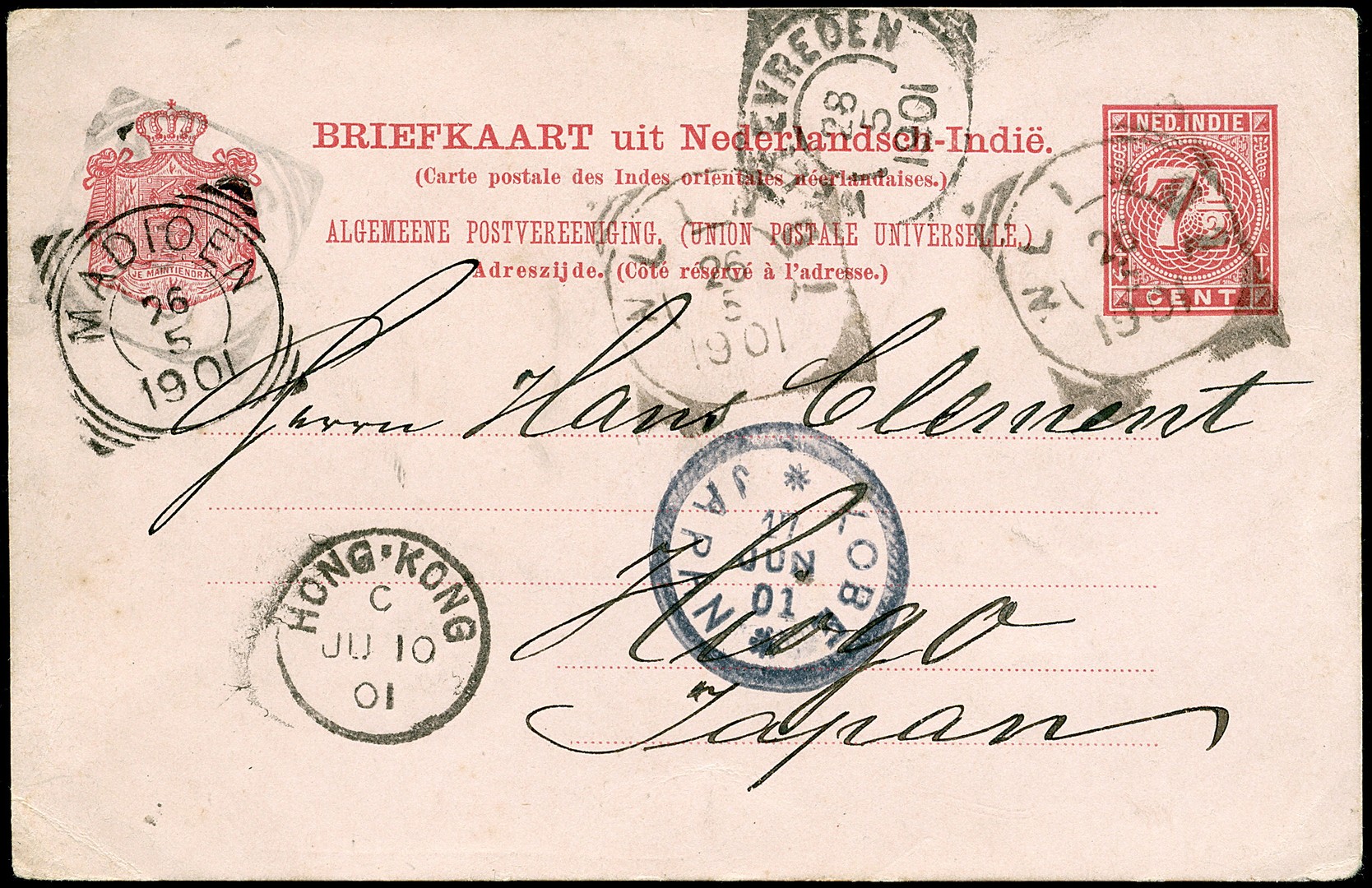 AZIË. JAPAN. Bk. G12 van Wlingi 26-5-1901 via Madioen, Maos en Weltevreden 28-5 over Hong Kong 10-6 naar Kobe 17-6 (Hiogo)