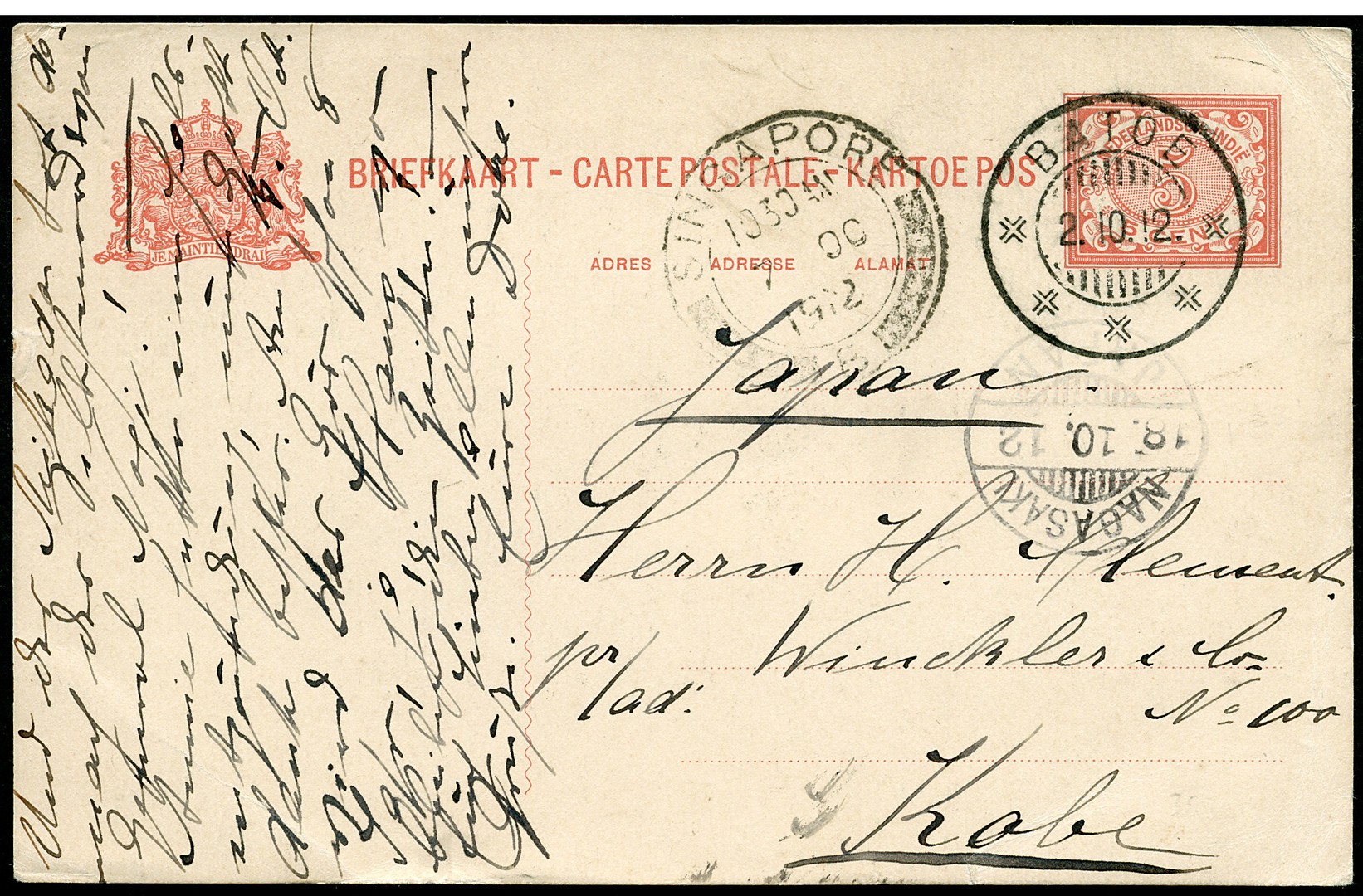 AZIË. JAPAN. Bk. G21 van Batoe 2-10-1912 (SvL 100) over Singapore 7-10 en Nagasaki 18-10 naar Kobe