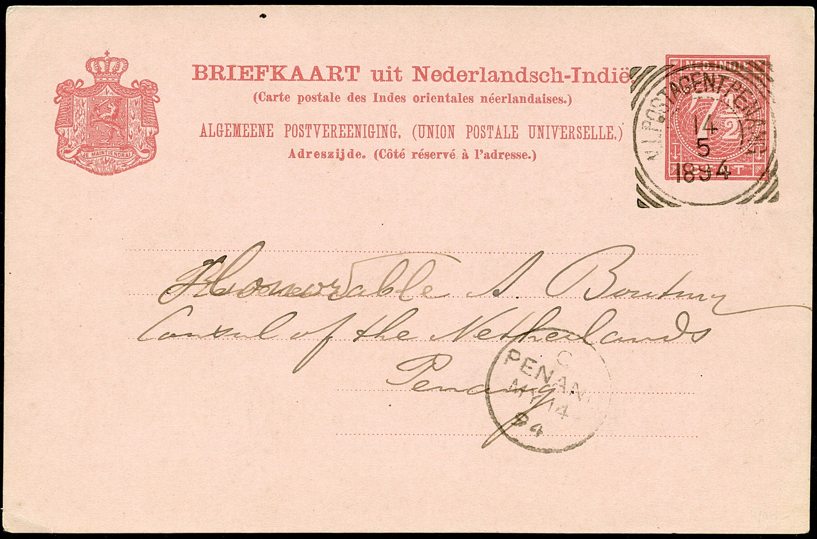 AZIË. MALAYSIA ETC. Bk. G12 op 10-5-1894 geschreven in Telok Seumawe, pas afgest. op de N.I.Postagent Penang 14-5 en verder naar de Nederlandse consul te Penang 14-5