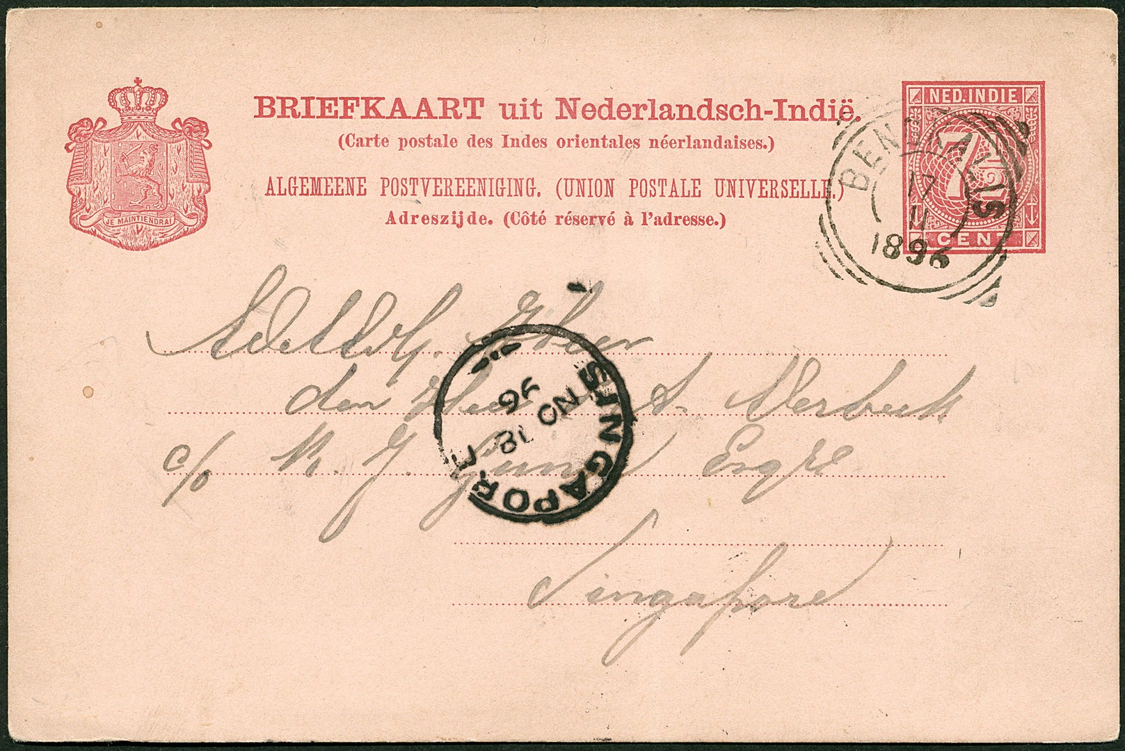 AZIË. MALAYSIA ETC. Bk. G5 van Bengkalis 10-4-1886 (kleinrond) naar een logé van het Hotel de l’Europe in Singapore 12-4, alsmede bk. G12 geschreven te Siak op 16-11-1896 van Bengkalis 17-11-1896 (vierkant) naar Singapore 18-11