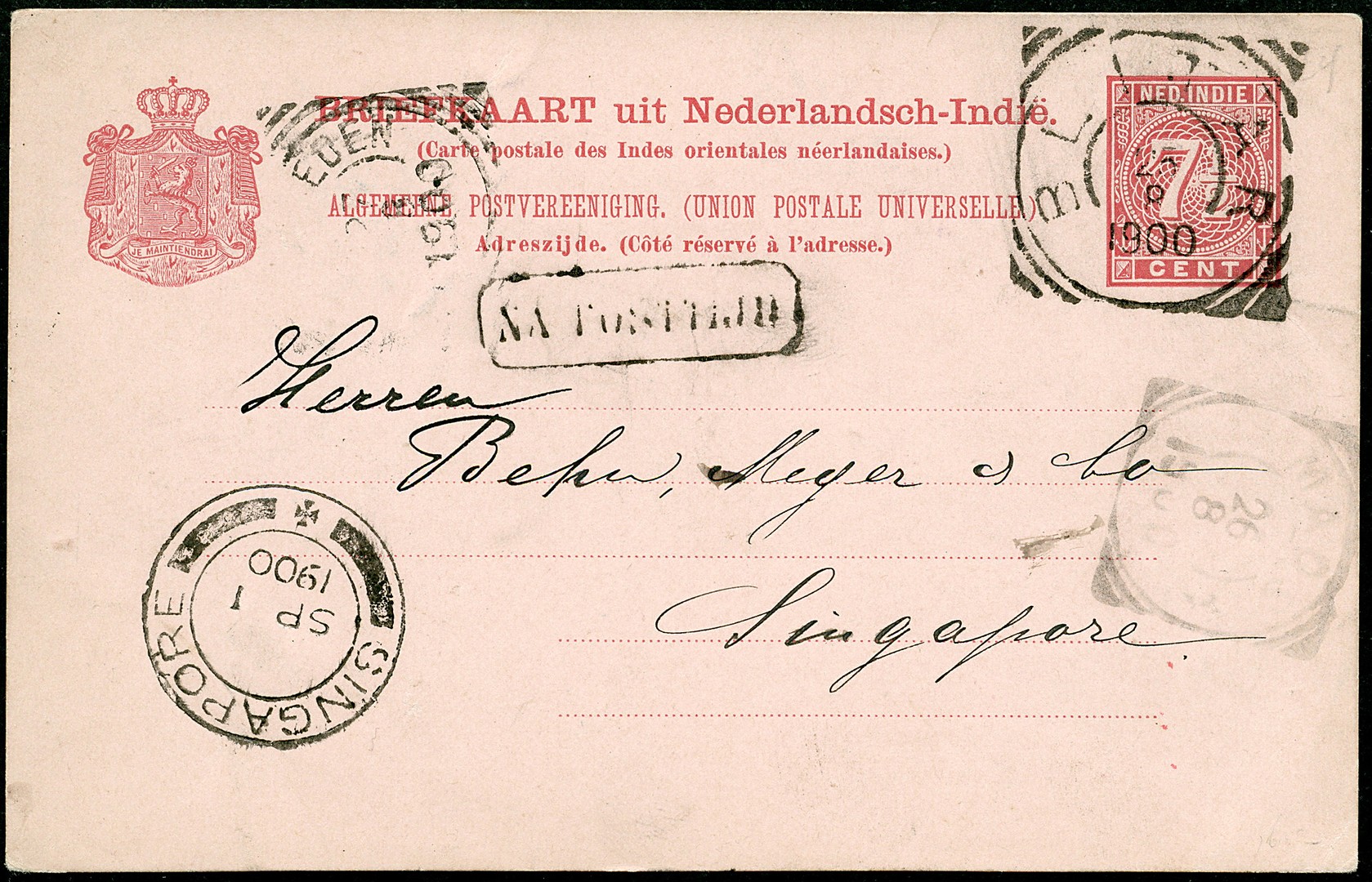 AZIË. MALAYSIA ETC. Bk. G9 van Belawan (naamstempel in blauw) over Laboean Deli 11-3-1892 naar de Consul-Generaal der Nederlanden te Singapore 15-3, alsmede bk. G12 ‘Na Posttijd’ van Blitar 25-8-1900 (groot model vierkantstempel) via Maos en Weltevreden naar Singapore 1-9