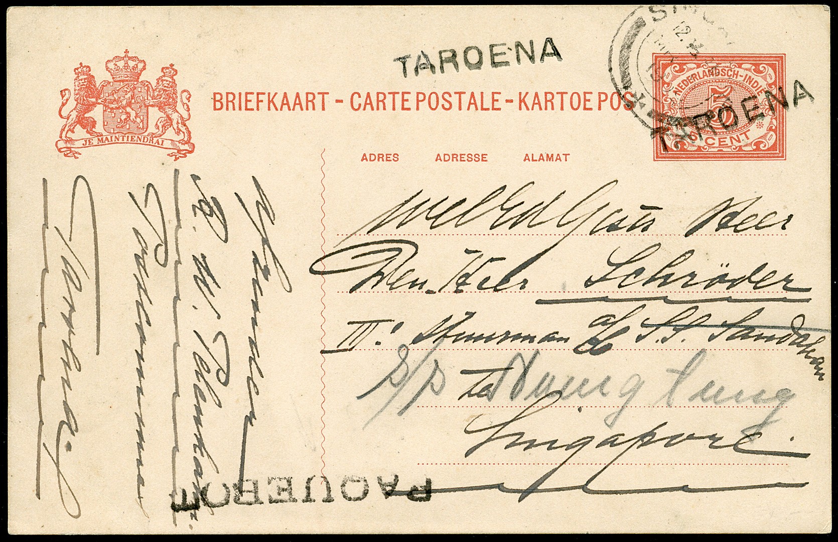 AZIË. MALAYSIA ETC. Bk. G17 door de postcommies van TAROENA geschreven op 26-1-1909 naar een derde stuurman te Singapore 8-3 met op vz. tevens ‘Paquebot’