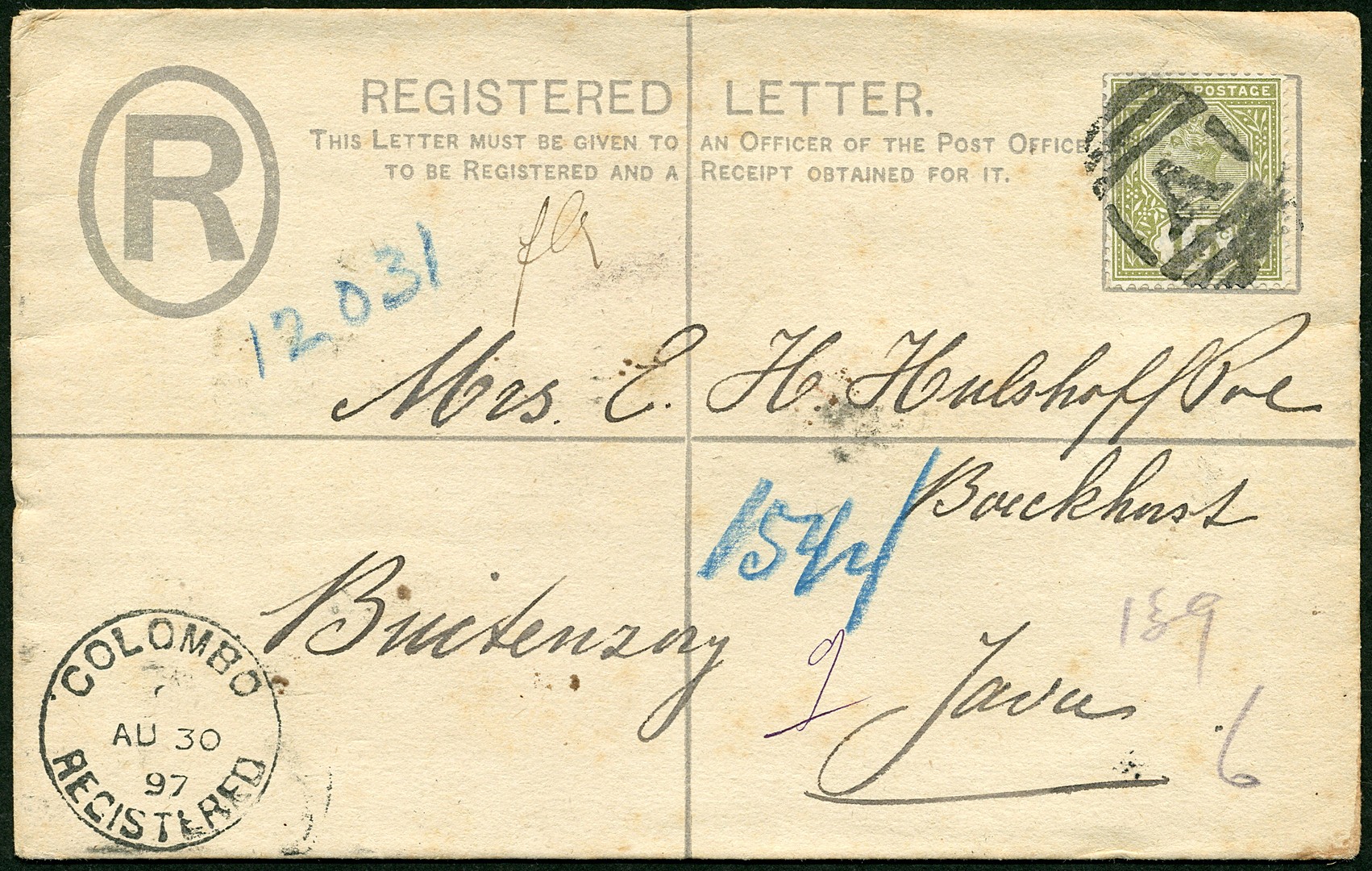 CEYLON. R-env. van 10c bijgefr. met 15c van Colombo 30-8-1897 via Bangkok 15-9, Singapore 20-9, de N.I.Agent Singapore 20-9 en Batavia 24-9 naar Buitenzorg 24-9