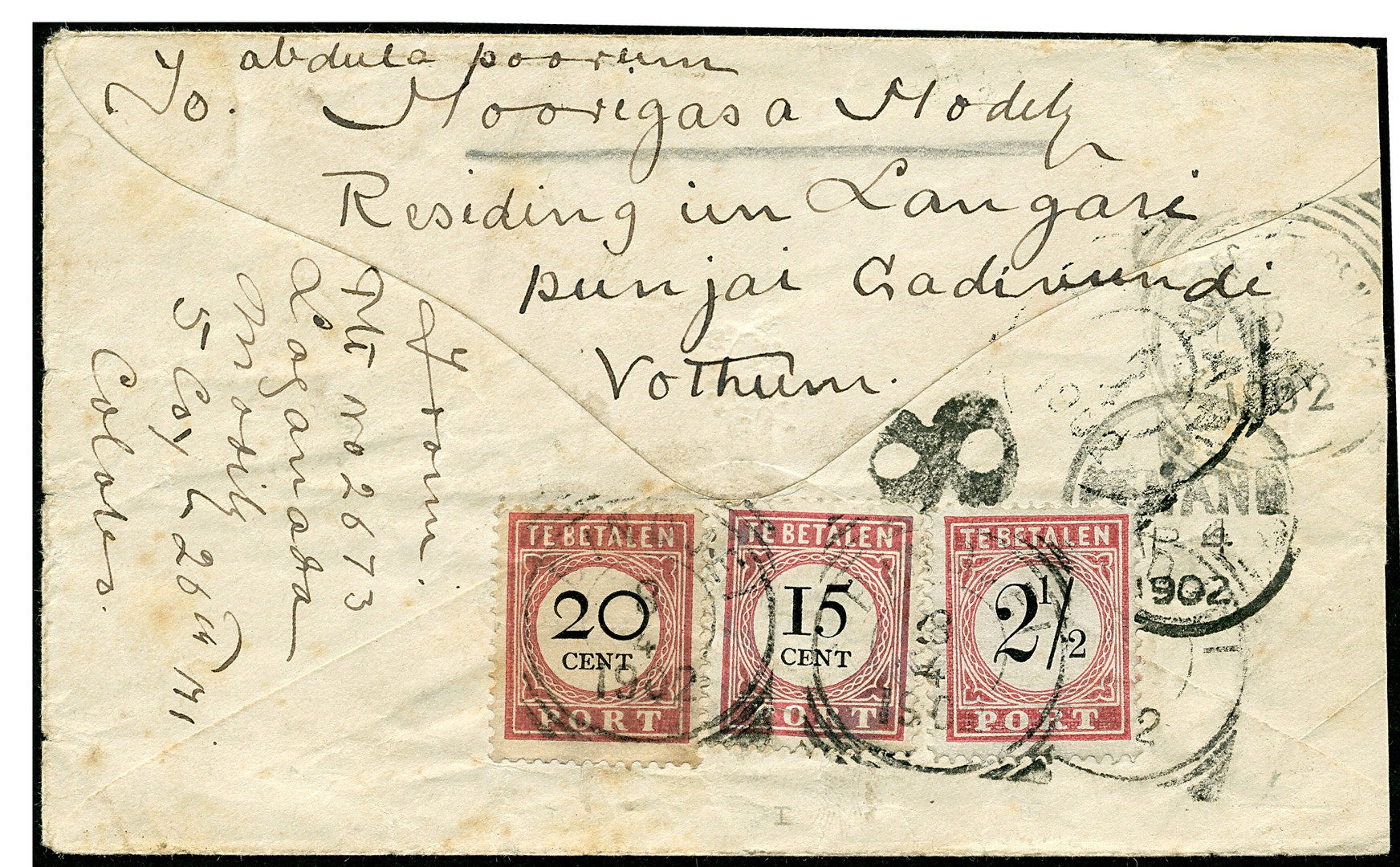 CEYLON. Ongefrankeerd verz. env. (gebruikssporen) uit een plaats waar mogelijk geen zegels verkrijgbaar waren, via Colombo 29-3-1902, Penang 4-4, de N.I.Postagent Penang 5-4 en Medan 6-4 naar Bindjei en daar op 8-4 beport met 37½ cent (mengbeporting)