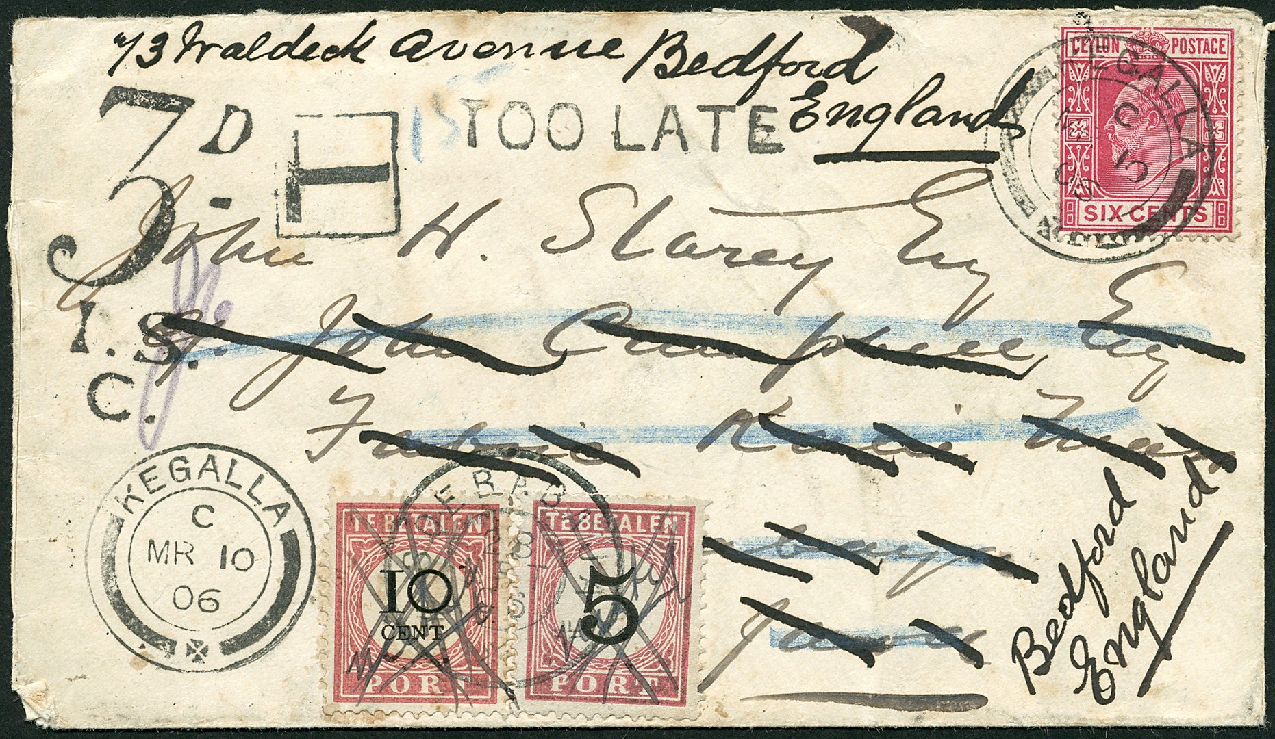 CEYLON. Env. ontoereikend gefr. met 6c van Kegalla 10-3-1906 per Railway Post Office 11-3 over Weltevreden 25-3 naar Soerabaja 27-3, daar op 28-3 beport met 10c + 5c, oninbaar en dus 'nietig' want de geadresseerde bevond zich al in Engeland, over Soerabaja 12-4 naar Bedford 10-5 en daar opnieuw beport (NB. op az. twee verschillende typen vierkant van Soerabaja, op vz. grootrond Soerabaja)