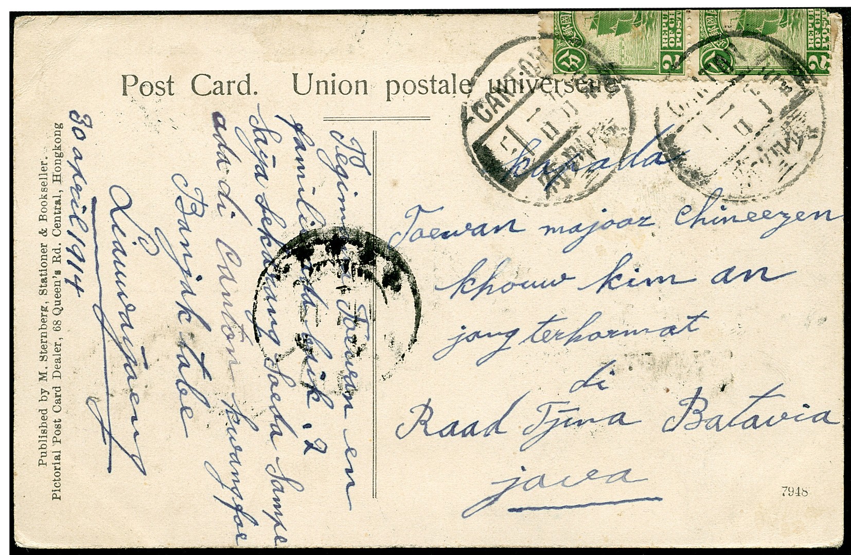 CHINA. Prentbk. gefr. met 2x 2c Jonk op eigenaardige wijze geplakt van Canton 30-4-1914 naar de Majoor der Chinezen Khouw Kim An te Batavia 11-5. Khouw was een destijds zeer vooraanstaande persoon met veel politieke en juridische invloed aangaande de gehele Chinese bevolkingsgroep in Nederlands-Indië. Historisch!