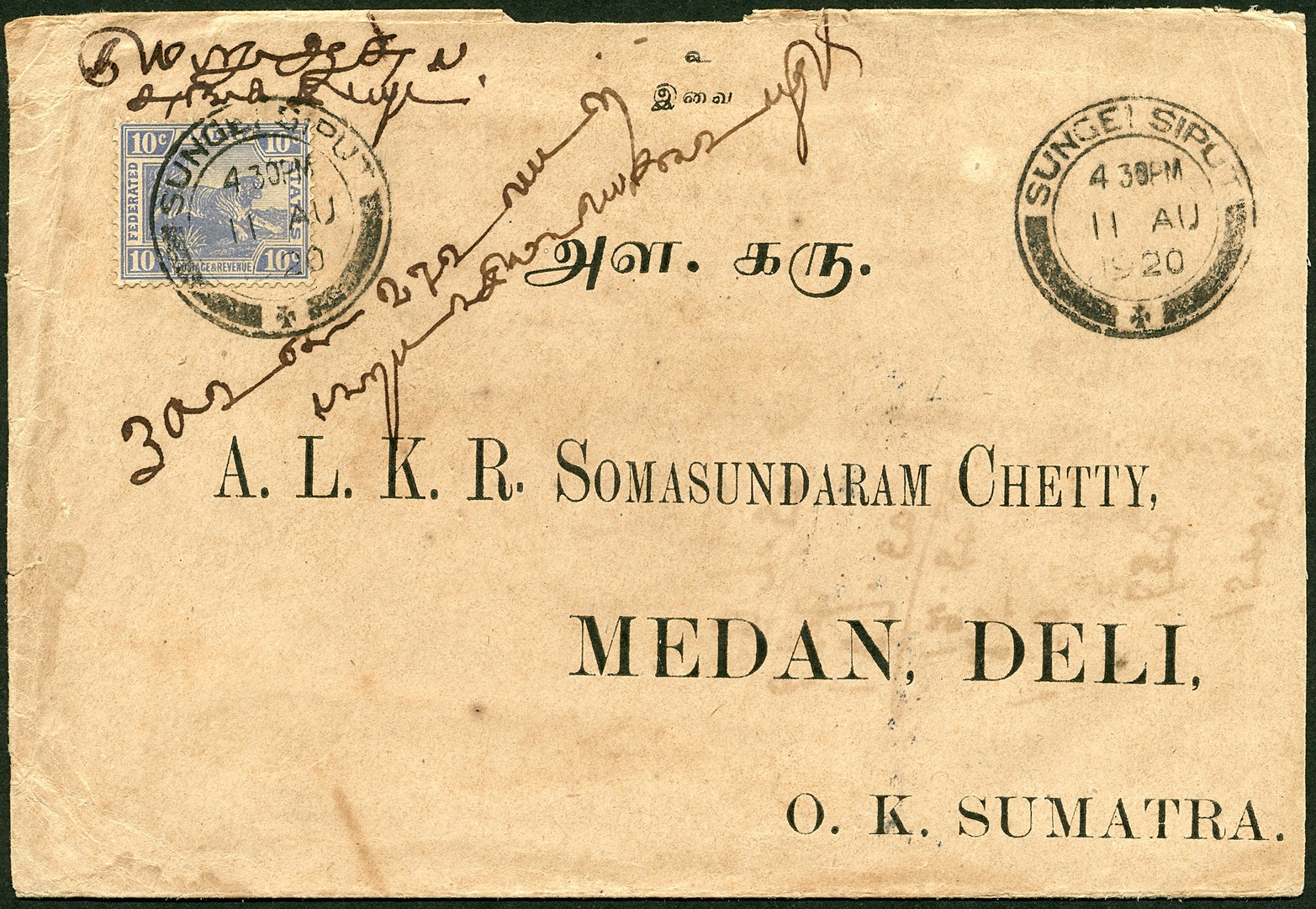 FED MALAY STATES. PERAK. Bedrijfsenv. gefr. met 10c van Sungei Siput 11-8-1920 o.a. via Penang 12-8, Penang / (N.I.Postagent) 12-8 (lichte afst. LB, SvL R) naar Medan 18-8