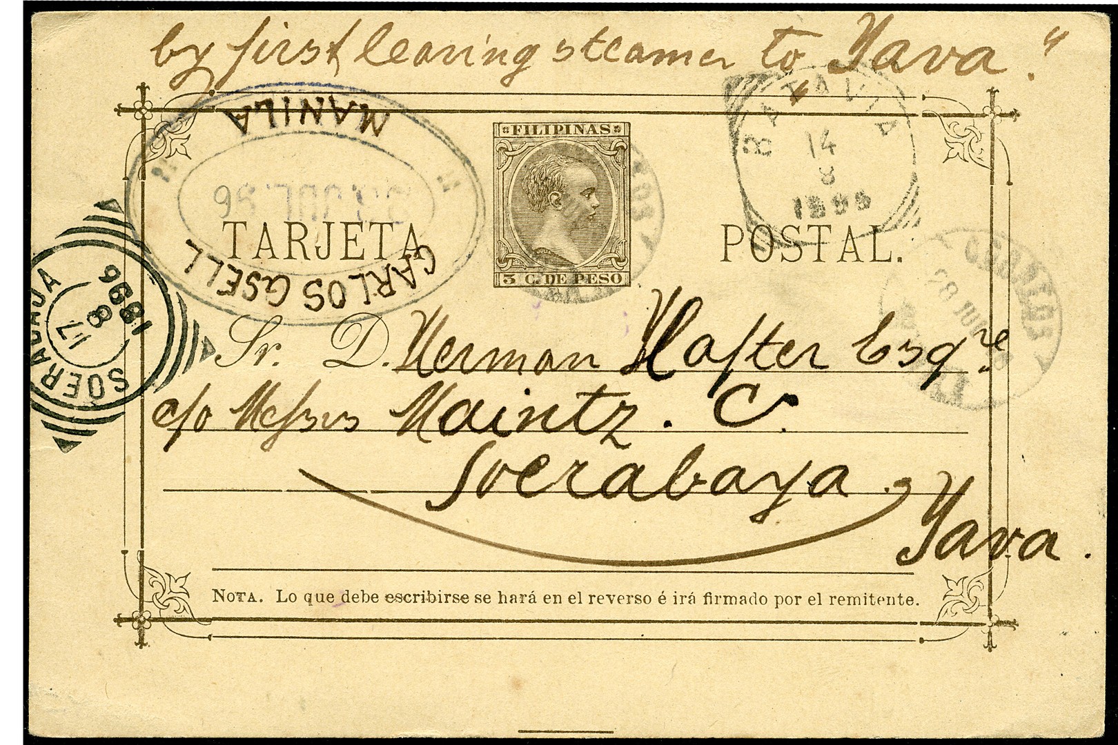 FILIPPIJNEN. Spaans. Bk. van 5p van Manila 28-7-1896 (ovaalstempel met pen overgetrokken) via Batavia 14-8 naar Soerabaja 17-8