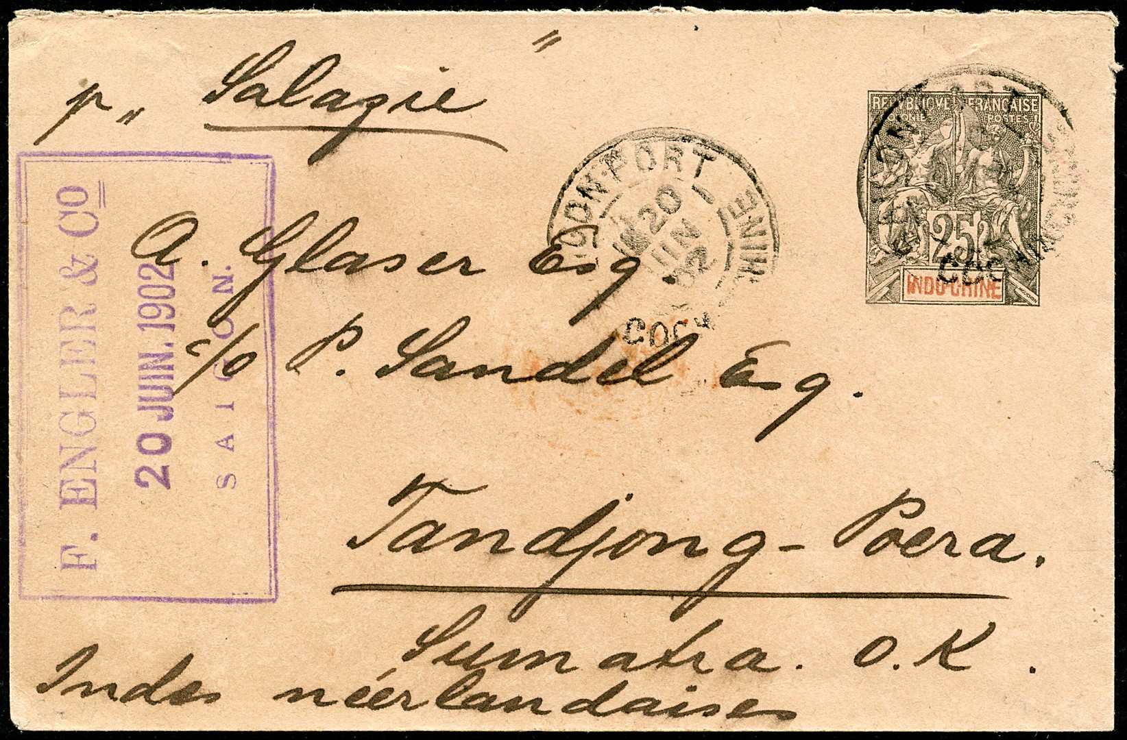 FRANS INDO-CHINA. Bk. van 10c van Cholon 11-6-1897 via de N.I.Agent Singapore 15-6 naar Medan (tevens prentbk. van Cholon, de Chinese wijk van Saigon), alsmede couvert van 25c van Saigon-Port 20-6-1902 over beide N.I. postagenten 22-6 resp. 26-6 naar Tandjoengpoera 27-6