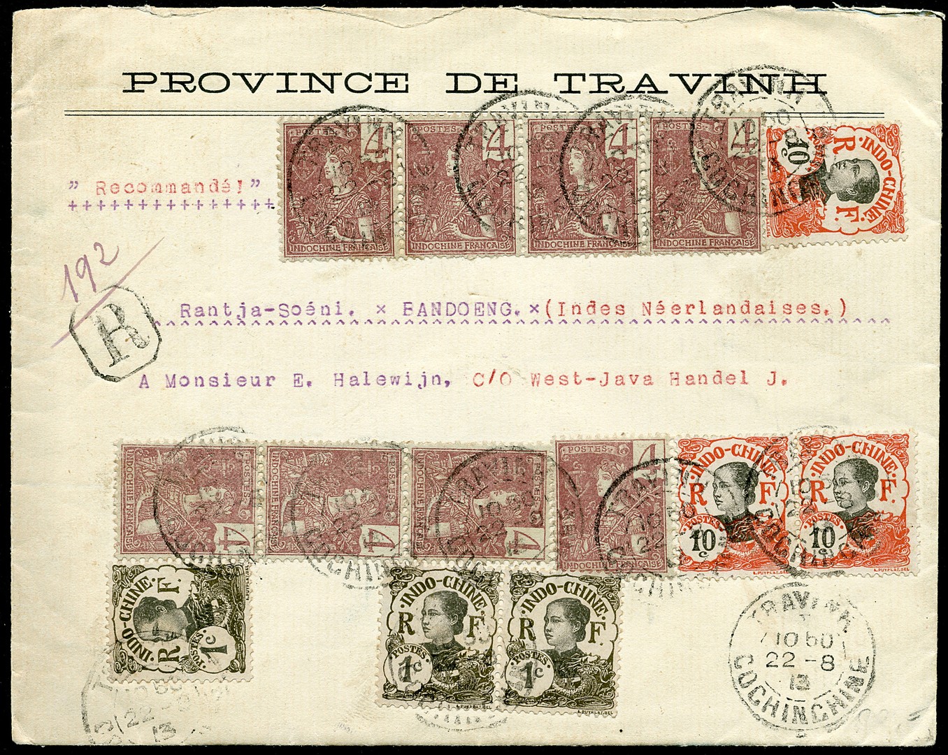 FRANS INDO-CHINA. Couvert van de 'Province de Tra Vinh' mooi gefr. met 1c (3x), 4c (8x) en 10c (3x) aangetekend van Travinh 22-8-1913 (in de Mekong Delta) over Saigon naar Bandoeng 7-9. Aantrekkelijk poststuk!