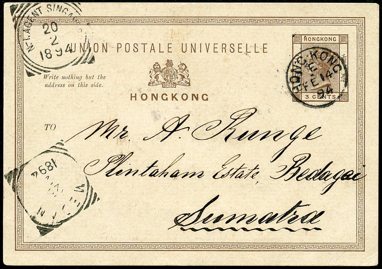 HONG KONG. Bk. van 3c op 14-2-1894 via de N.I.Agent Singapore 20-2 naar Medan 23-2
