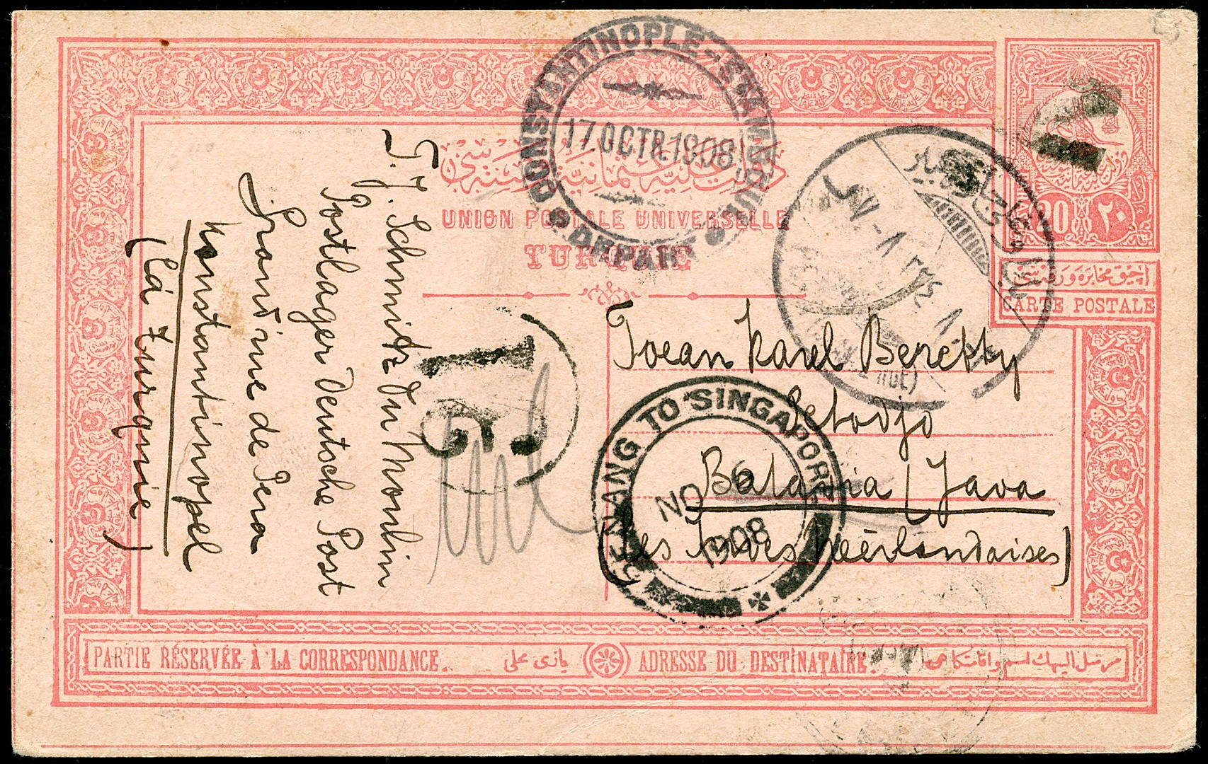 SCHEEPSPOST. PENANG TO SINGAPORE. TURKIJKE. Bk. van 20p van Constantinopel 17-10-1908 via Penang to Singapore 6-11 naar Batavia. Tevens prentbk. van Constantinopel