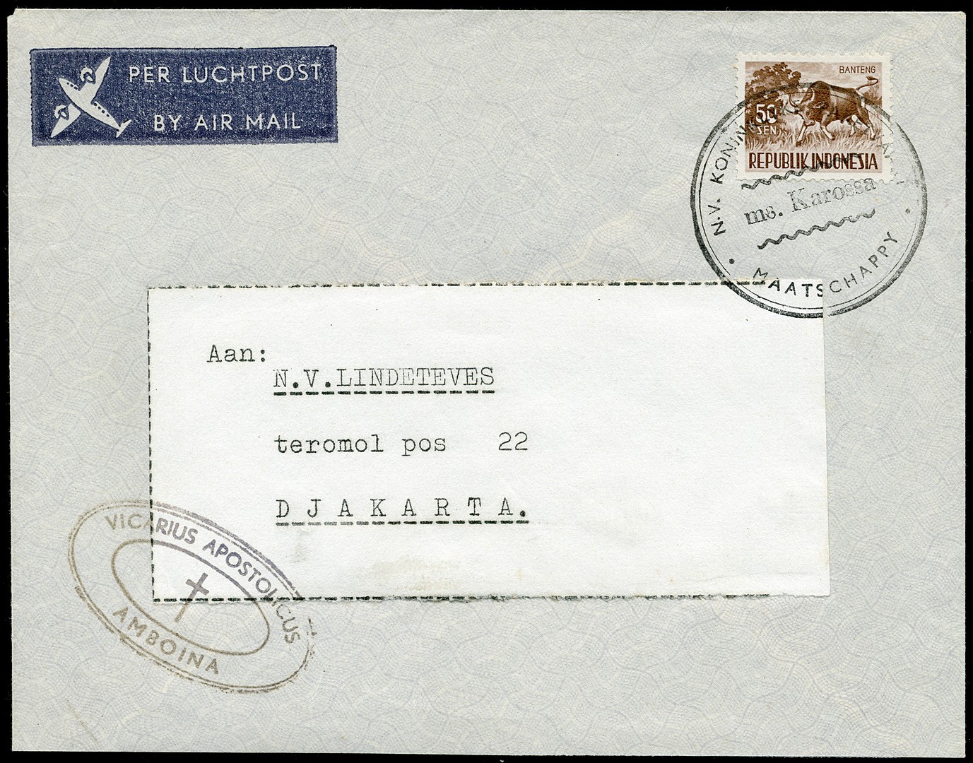 Env. uit Amboina gefr. met 50s afgest. met KPM-rondstempel 'ms. Karossa' in zwart, naar Djakarta (az. geschreven 2-8-56). Zeer zeldzaam stempel. Ex Verkuil