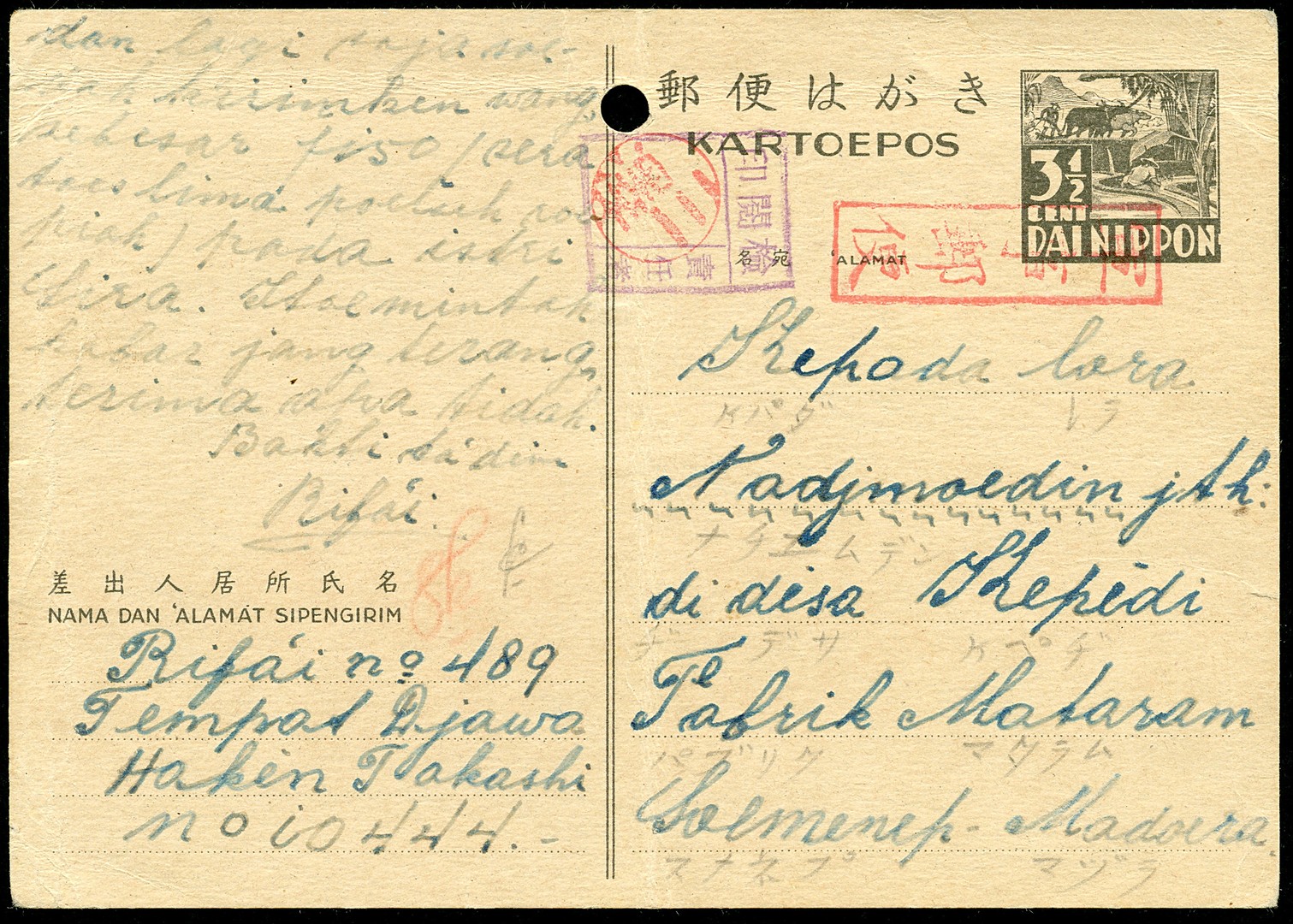 3½ Cent postcard Bu.3b (pinhole) from a Heiho (Fieldpost office Djawa Haken Takashi 10444) tied by Gun-ji-yu-bin (military post), censor Seki-nin-sha (Commanding officer), dated at the back 15.7.03, to Soemenep. Rare, not much correspondence by Heiho's left. Ex Tj. de Jong
