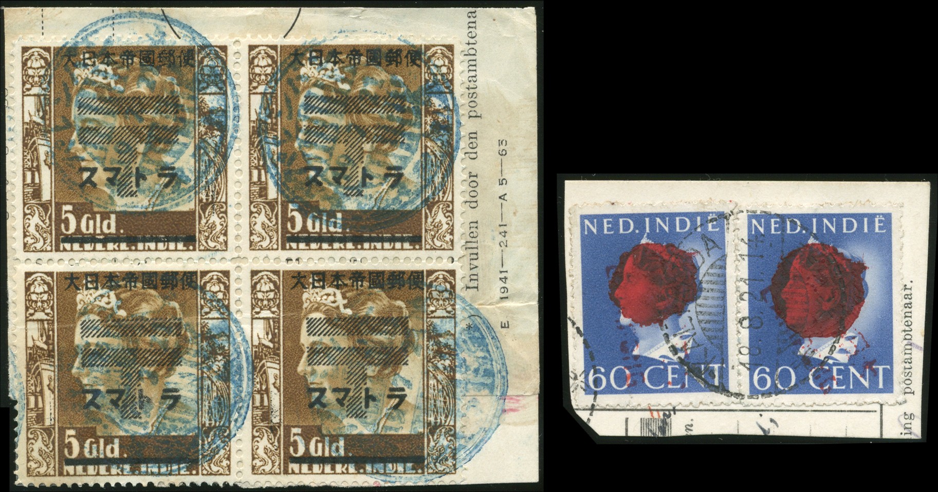 Small accumulation of stamps without overprints (6x), with overprints (24x), from Japan (6x) and Malaya (3x), most on pieces, some nice postmarks. Total catalogue value (2x no. 92z-41b with crease not counted) ca. € 350