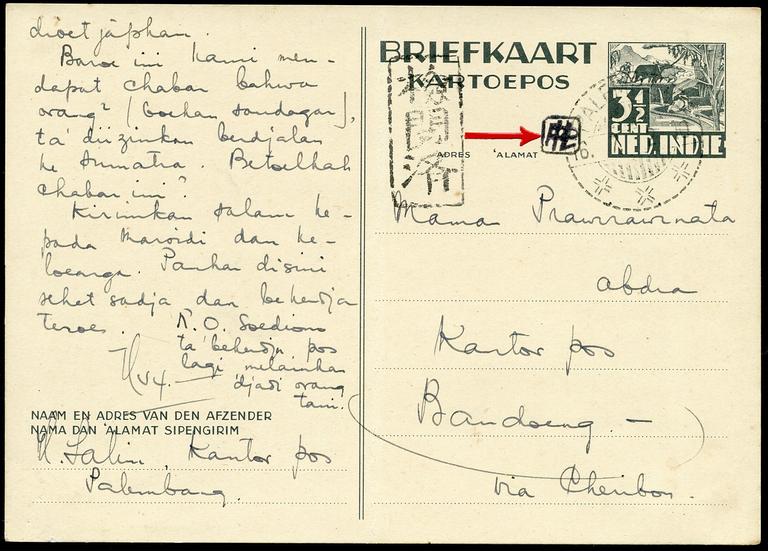 3½ Cent postcard (crease) with small IPL-overprint in frame Bu.61 from Palembang 16.7.2.10 'via Cheribon' (north coast Java) to Bandoeng. Censor Vr.102