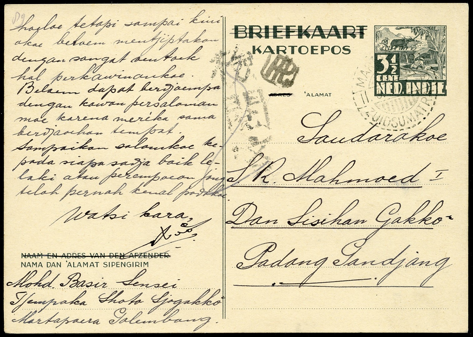 3½ Cent postcard with large IPL-overprint in frame Bu.65 from Martapoera- / Zuidsumatra 11.3.0.3.12 to Padang Pandjang. Censor Bu.JC14
