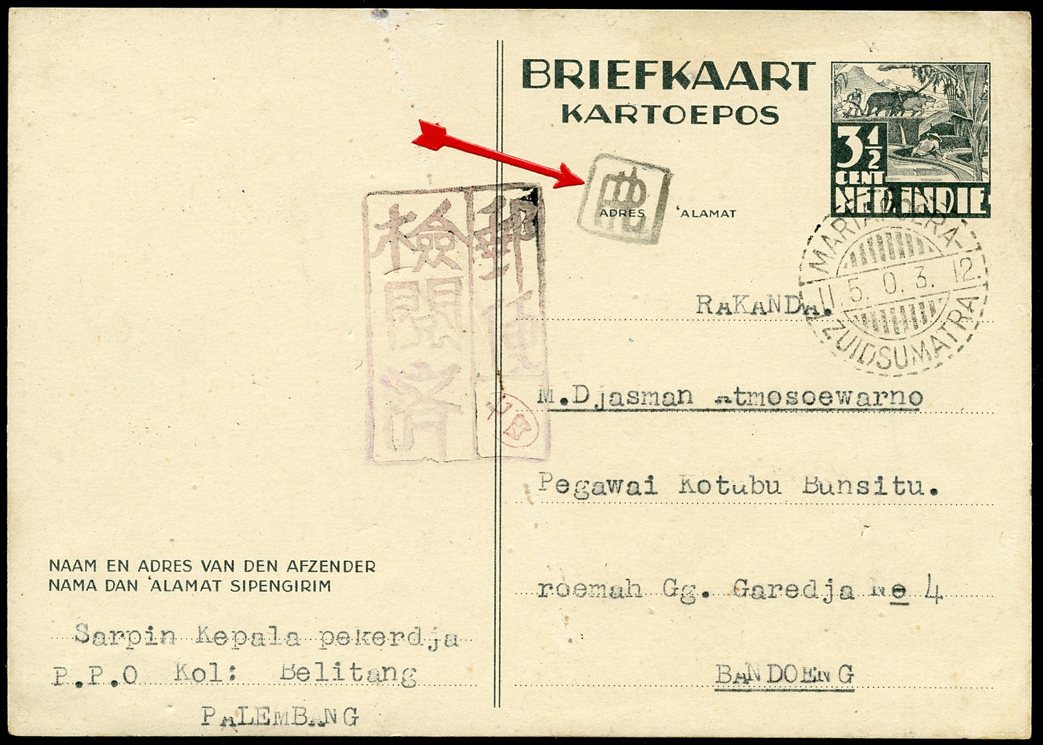 3½ Cent postcard with large IPL-overprint in frame Bu.65 from Martapoera- / Zuidsumatra 11.5.0.3.12 to Bandoeng (Java). Censor Bu.JC14c in blackish red