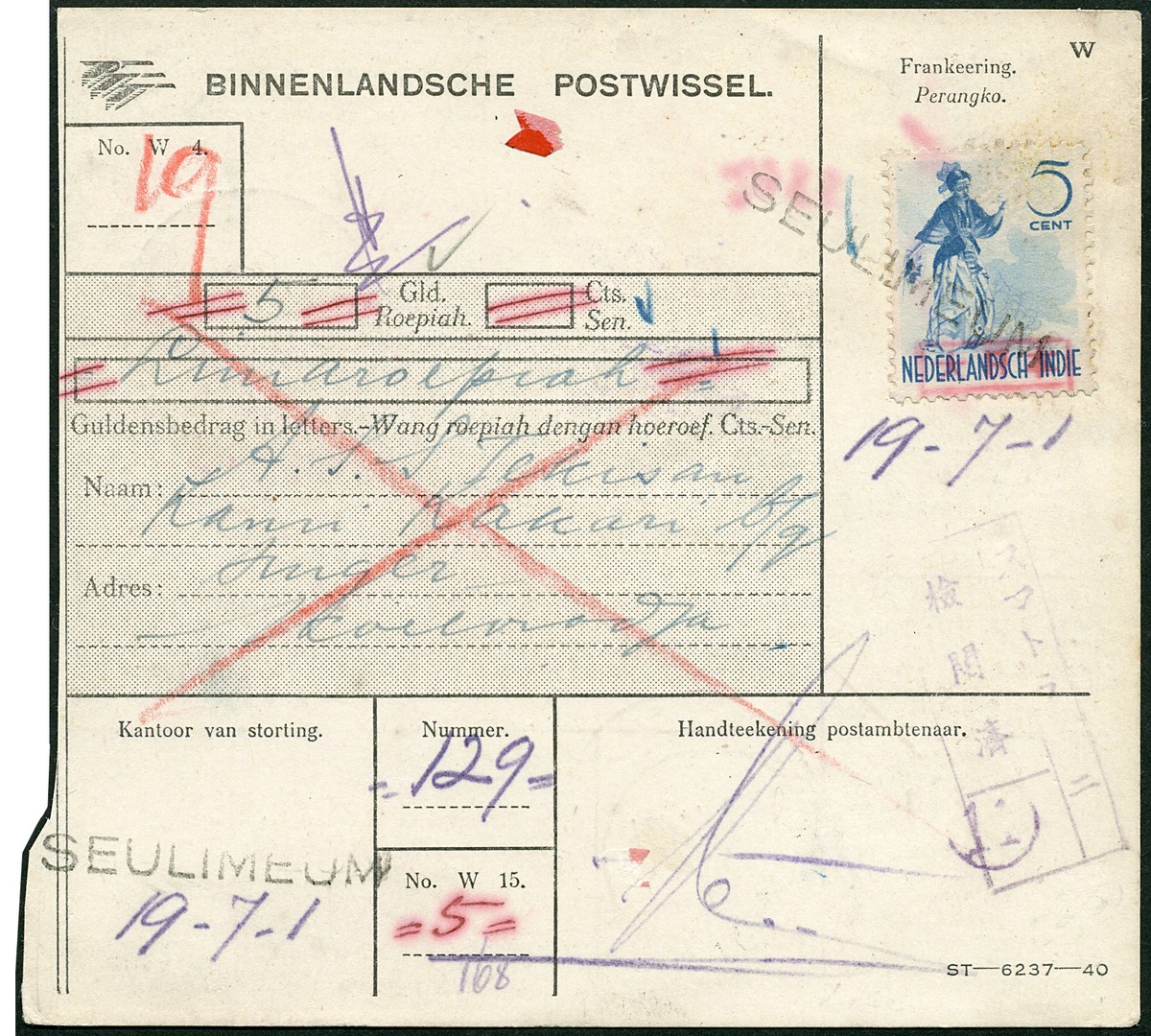 5 Cent dancer with framed red Dai Ni Hon overprint no. 822r-70 on complete M.O. Bu.JF1a tied by straight line SEULIMEUM (type 060, vNV RR) with written date 19-7-1 to Koetaradja 19.7.3. Two beautiful strikes of this very rare postmark